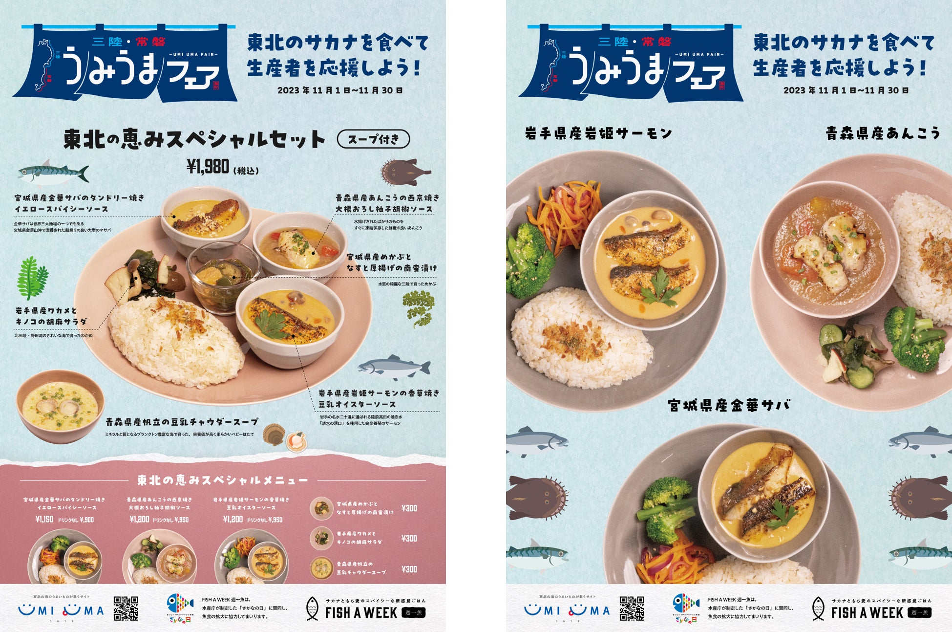 11月1日(水)から11月30日(木)の期間中、キッコーマンが運営する新感覚サカナごはん 「FISH A WEEK 週一魚」とコラボします。「FISH A WEEK 週一魚」とは、“おいしく食べていたら、いつのまにか健康的な食生活を実践している”というコンセプトの飲食サービスです。今回のコラボでは、店舗やキッチンカー、デリバリーにてUMIUMAの商品を使ったメニューの販売を行います。店舗限定で、和・洋・中の様々なジャンルのスパイスを使ったソースが特徴的な「東北の恵みスペシャルセット」を販売します。三陸・常磐の海の幸を使った健康的で新感覚なごはんをぜひお楽しみください。