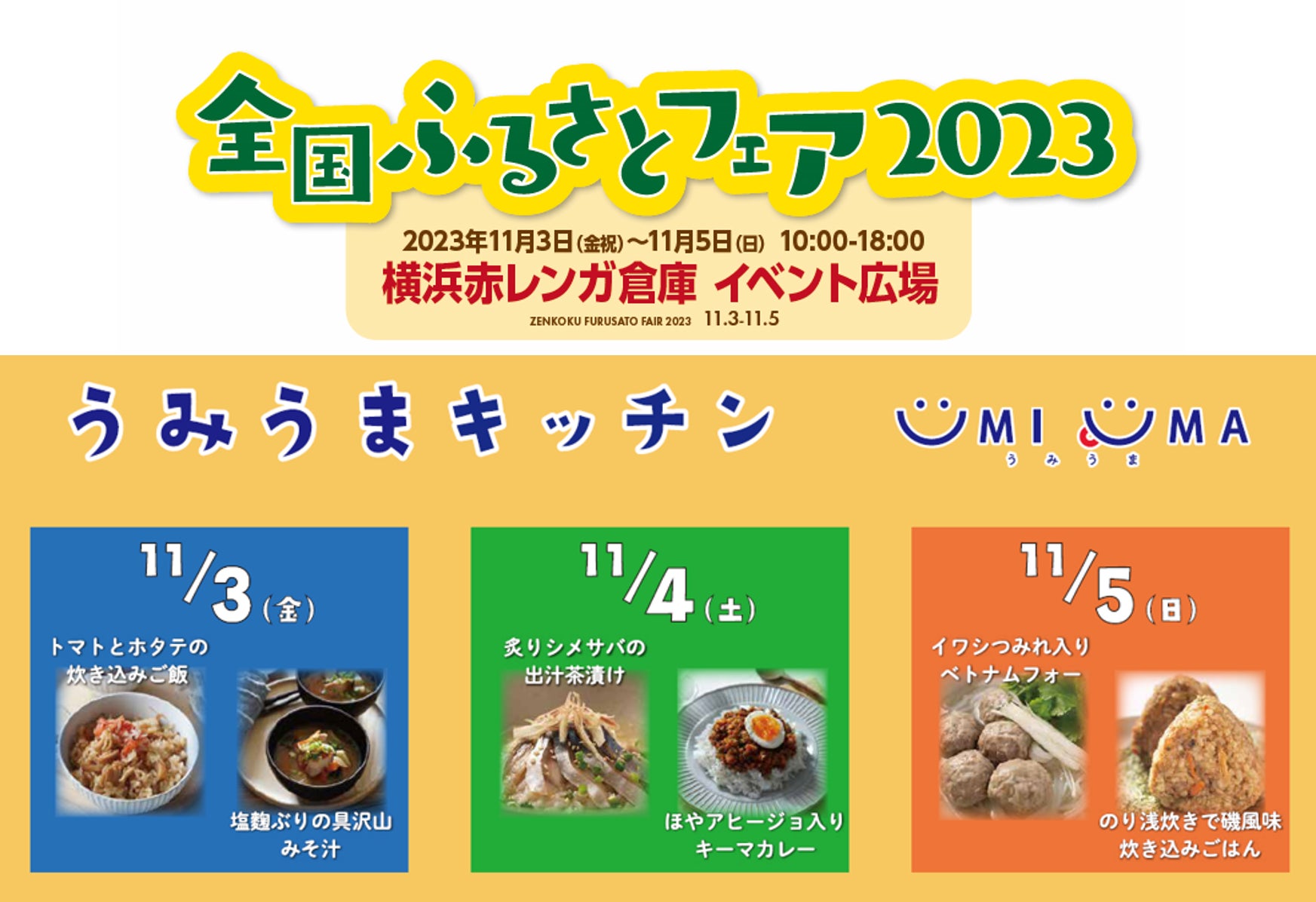 11月3日(金・祝)〜11月5日(日)の期間、横浜赤レンガ倉庫 イベント広場で開催する『全国ふるさとフェア2023』に出展します。『全国ふるさとフェア』は「全国の郷土や食文化を広く一般に情報発信しよう」という主旨で美味しいものが集まるフードイベントです。様々な水産加工品を販売するほか、うみうまキッチンでは、「炙りシメサバの出汁茶漬け」や「イワシつみれ入りベトナムフォー」などのUMIUMAグルメを提供します。食欲の秋に相応しい三陸・常磐地方の絶品の海の幸をお楽しみください。