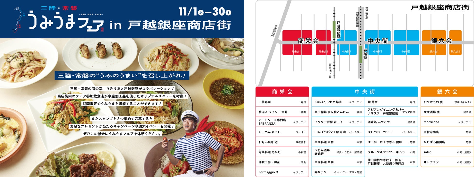 11月1日(水)から11月30日(木)の期間中、関東有数の長さを誇る商店街である戸越銀座商店街とコラボし、商店街内飲食店・物販店30店舗で三陸・常磐の海の幸を使った料理や物販が提供されます。またスタンプを3つ集めると素敵なプレゼントが当たるキャンペーンや週末限定のイベントも開催します。下町情緒あふれる商店街で食べられる期間限定の”うみうま“をぜひお楽しみください。