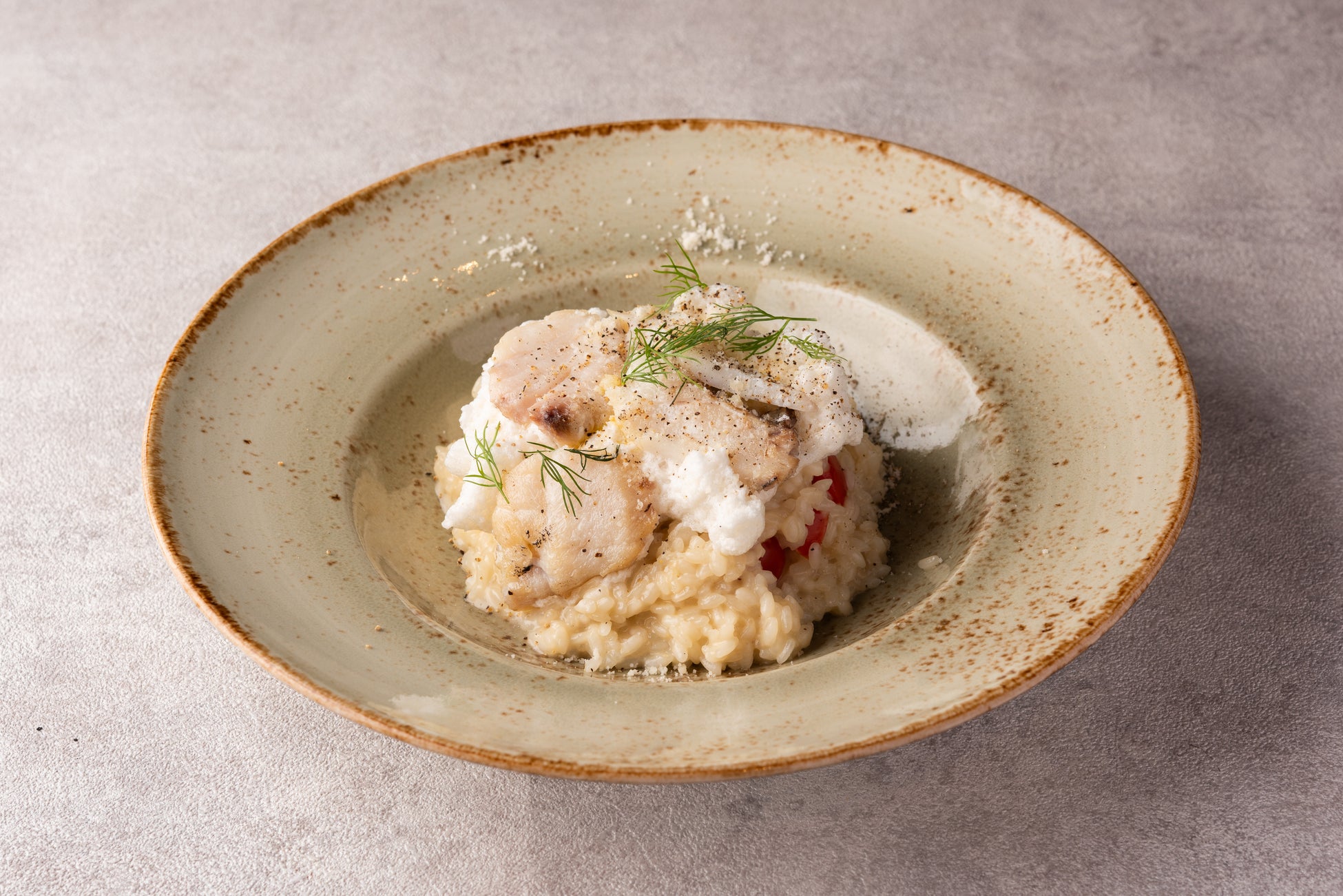 メニュー名:青森県八戸産タラと鮎魚醤のメレンゲ.フレッシュトマトのクリームリゾット
