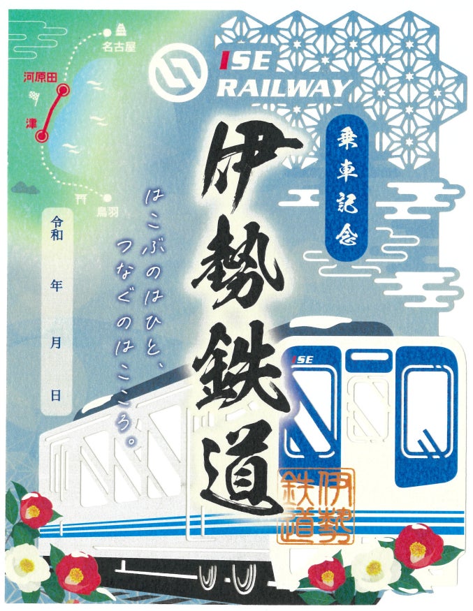 ※伊勢鉄道初の「切り絵」により製作した鉄印です。これから迎える冬をイメージし、車両と椿に雪が冠しています。