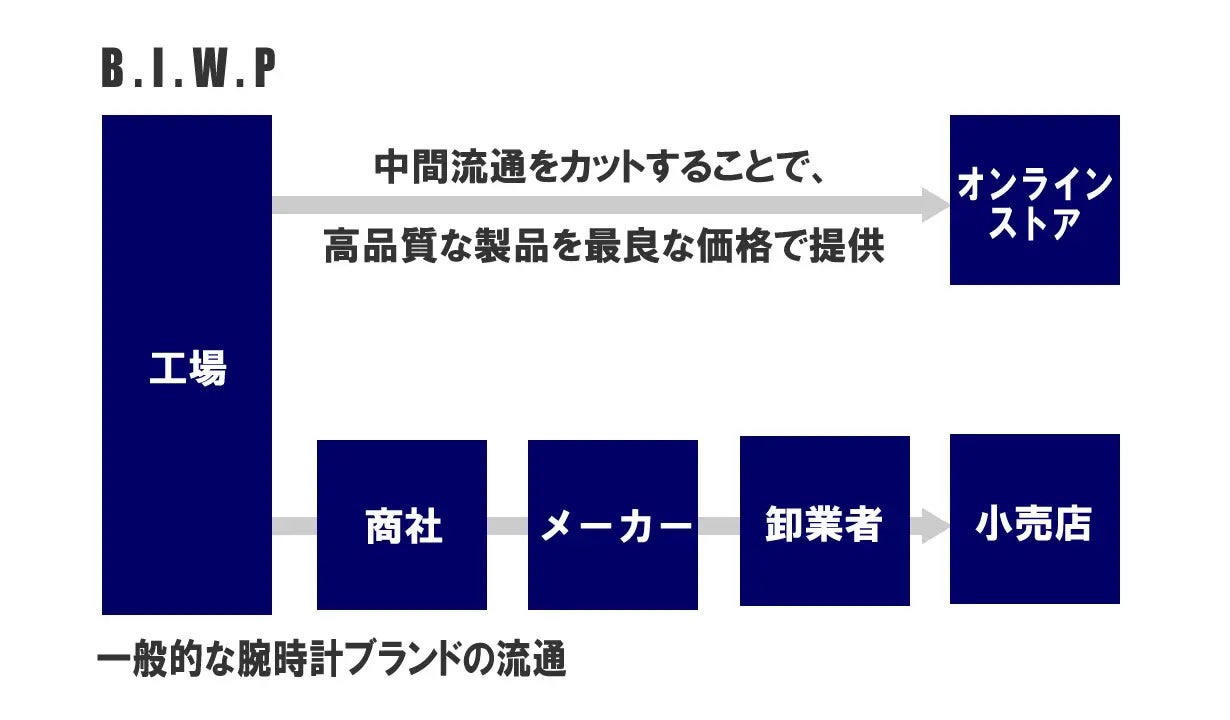 今回のプロジェクトではブルーインパルスの日本製GMT時計を4万円台から実現!この価格で提供できる理由は従来の腕時計販売の販売手法を見直し、企画から生産・販売までを一貫して行うビジネスモデルを採用したからです。中間マージンの削減によって、最良な価格で提供します。
