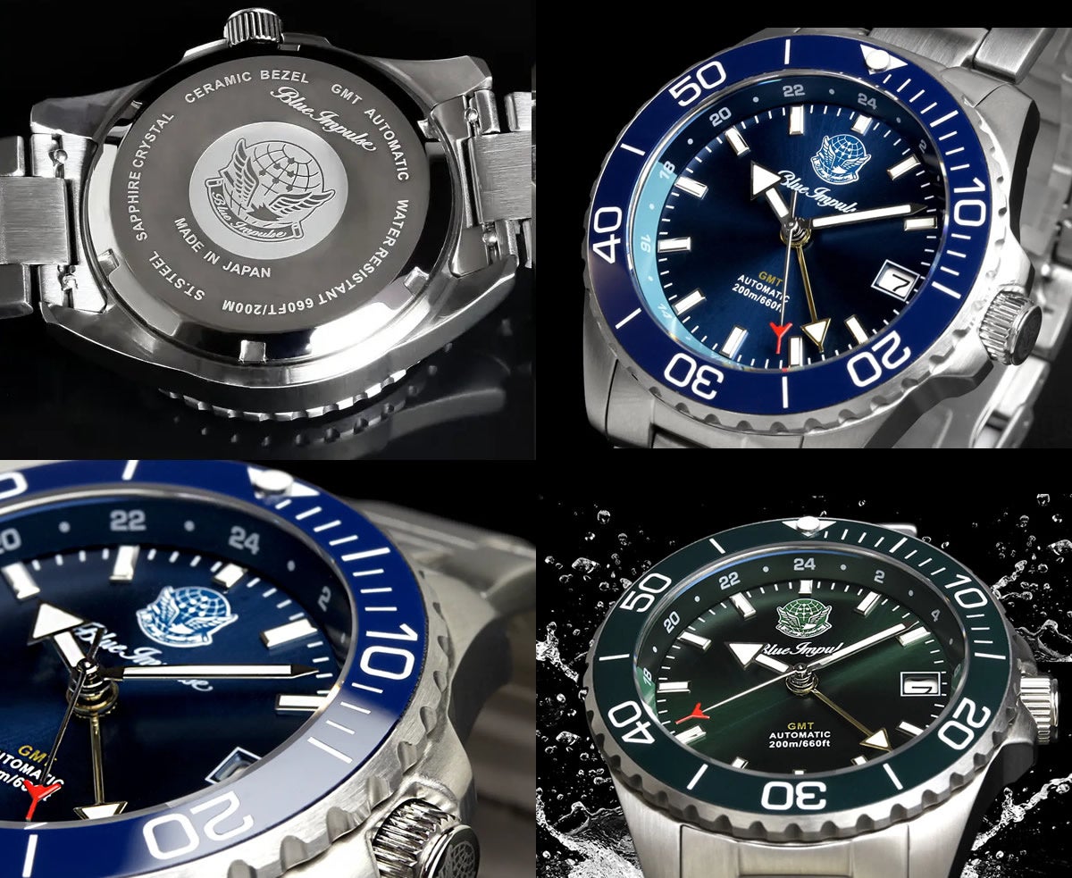 ブルーインパルスの魅力を詰め込んだプレミアム仕様の日本製GMTダイバーズ自動巻き腕時計!品質に一切の妥協を許さない、腕時計のプロ集団が手がける時計プロジェクト第三弾!