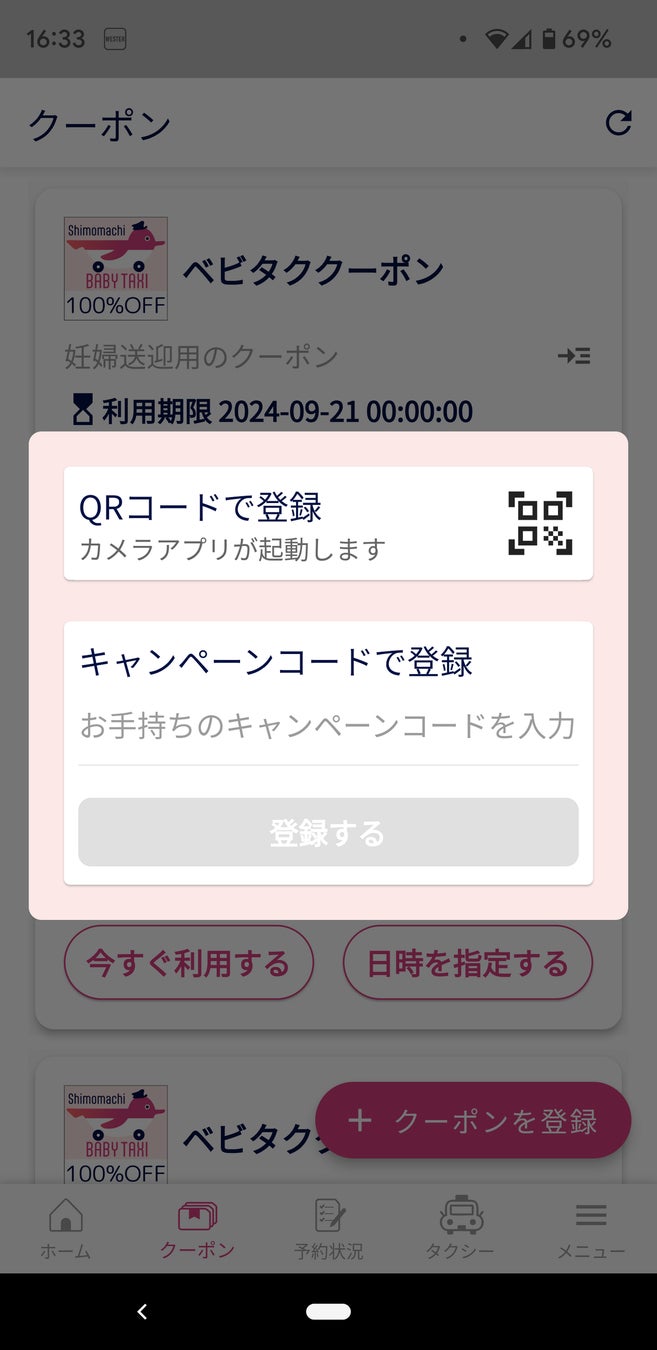 クーポンコード又はクーポンQRからアプリ内にクーポンを取得することができ、クーポンを利用して、サービスを利用することができます。
