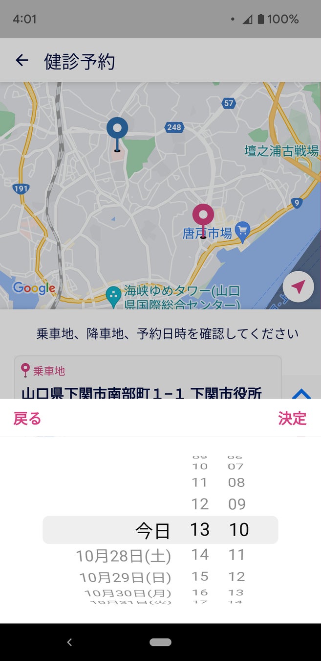 事前登録したお迎え場所「自宅などの居所」と送り先「かかりつけの医療機関」が自動で設定され、1週間先までの日時指定予約ができます。