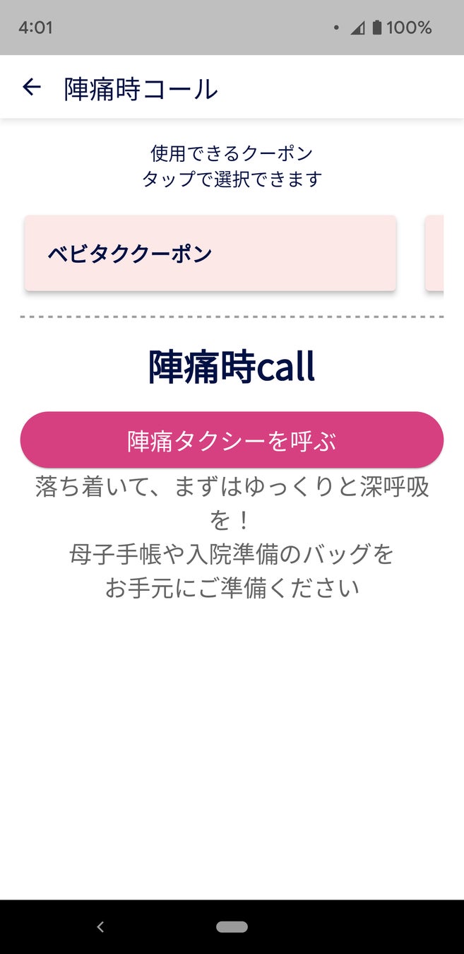 陣痛などの緊急時の際にはアプリから専用コールセンターへ簡単に電話発信することができます。