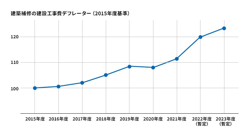 近年急激に建築補修の施工費用が増加。2023年時点で2015年に比べて建築補修費用が1.2倍以上になっています。このこともまた、大規模修繕費用の不足に拍車をかけています。