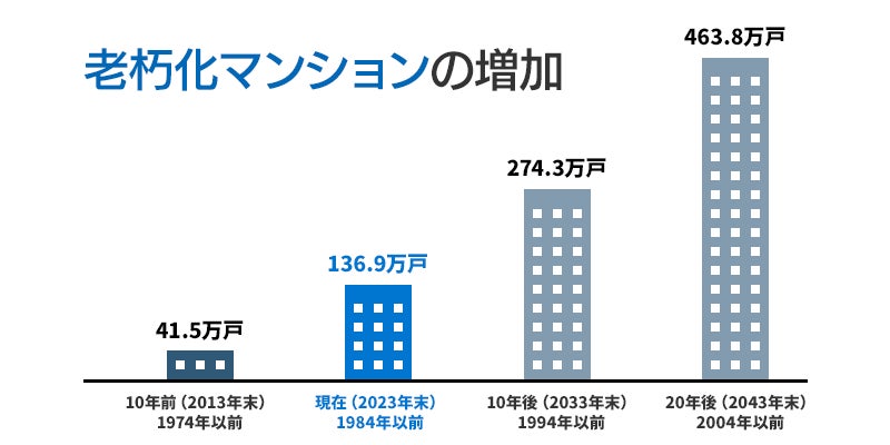 現在、築古マンションは増え続けています。2023年末時点で築40年以上のマンションは136.9万戸。
