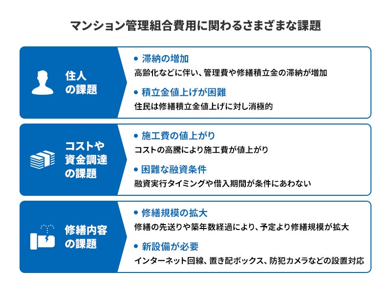 しかし、マンション管理を取り巻く環境は大きく変化しており、大規模修繕工事を実施したいマンション管理組合は「修繕積立金滞納住民の存在」「施工費の値上がり」「修繕規模の拡大」などの様々な課題を抱えています。