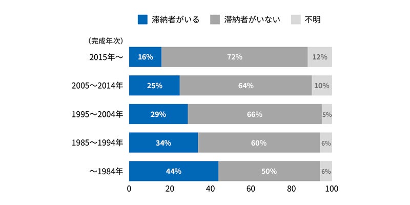 全体では約3割のマンションに管理費および修繕積立金の滞納者が存在しており、高経年マンションになるほど増加する傾向にあり、このことは大規模修繕費用の不足の一因になっています。