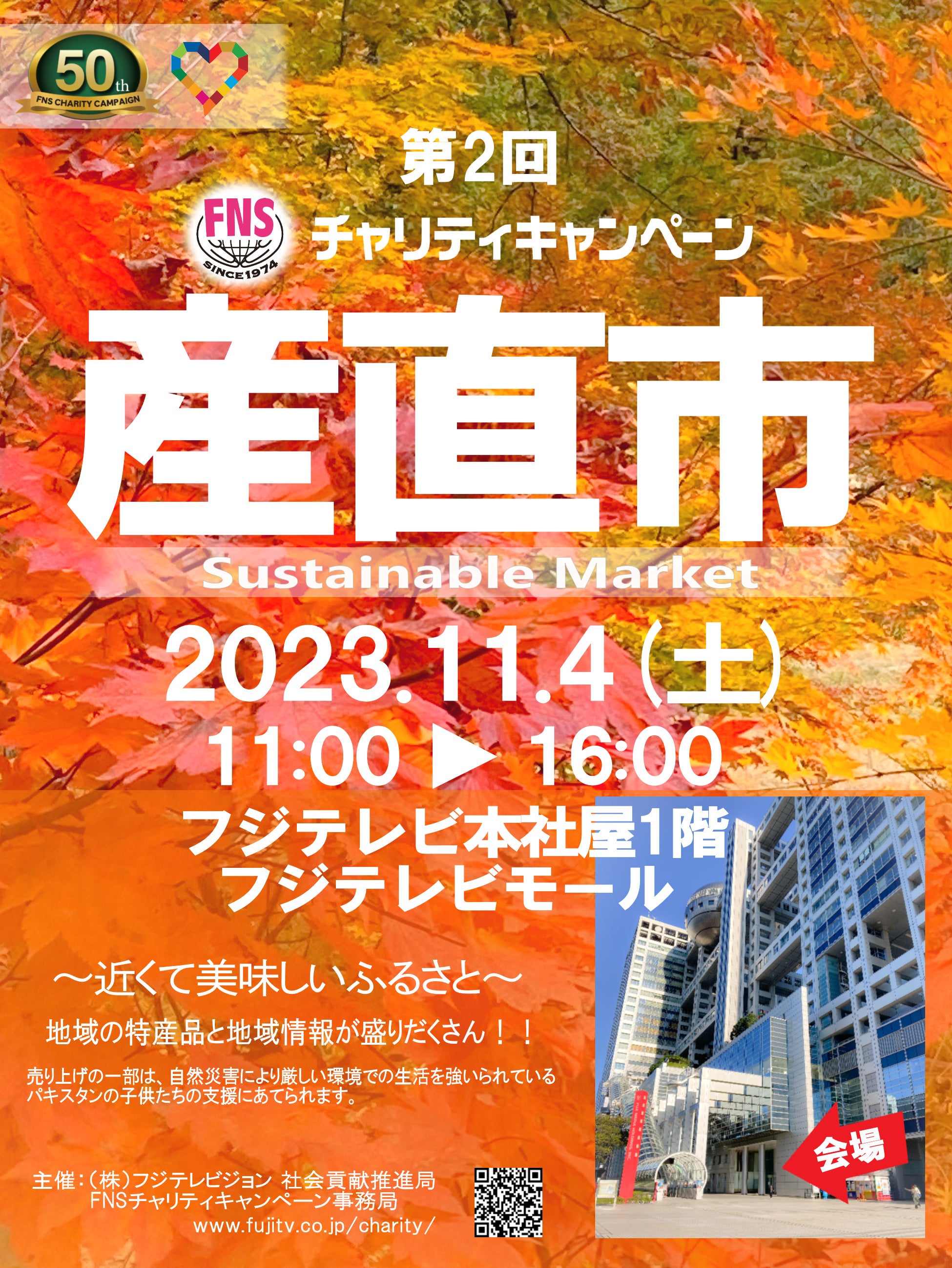 第22回ドリーム夜さ来い祭りと連動し、2023年11月4日(土)にフジテレビで第2回FNSチャリティ産直市を開催。福島県や新潟県津南町の特産品などを販売し、売上の一部をパキスタンの子どもたちの支援に。
