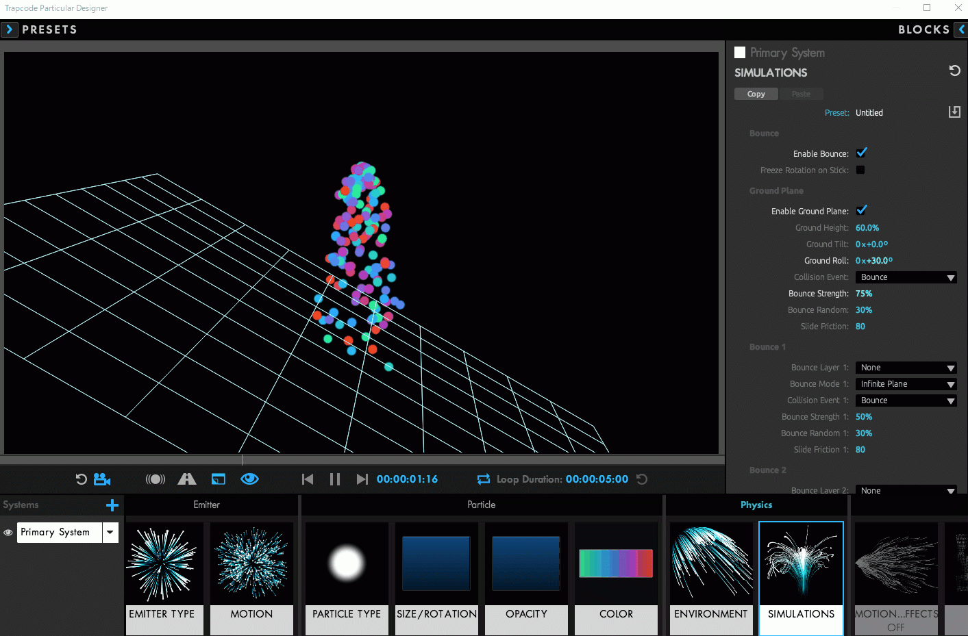 新しく内蔵されたバウンスグランド平面は、独自の高さと回転コントロールを持つ追加のバウンスサーフェイスとして機能します。これにより、VFXやモーショングラフィックのアーティストは、クリック数回で簡単に無限のバウンス平面を設定できます。この新しいバウンス平面には、いくつかのデザイン済みのセットアップが付属しており、独自のバウンスプリセットを作成して保存することができます。