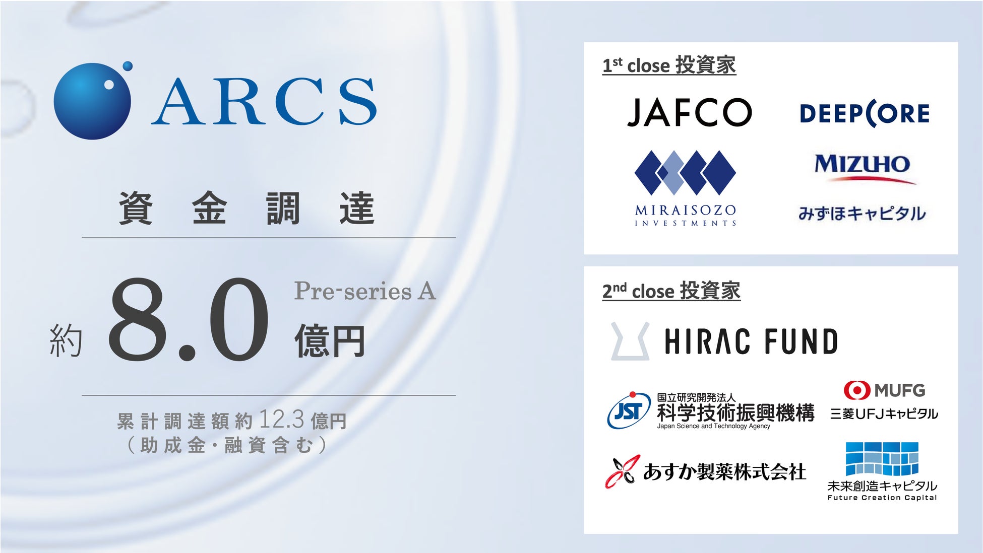 生殖補助医療の自動化の実現を目指す株式会社アークス(本社:東京都渋谷区、代表取締役:棚瀬将康、以下「アークス」)は、2025年1月17日に実施したプレシリーズAラウンドの1st close(約5.3億円)に続き、このたび約2.7億円を追加調達し、プレシリーズAラウンドを総額約8.0億円でクローズいたしました。本ラウンドでは、新規投資家であるHIRAC FUND 2号投資事業有限責任組合、国立研究開発法人科学技術振興機構(JST)、あすかイノベーション投資事業有限責任組合、三菱UFJ キャピタル 9号投資事業有限責任組合、未来創造投資事業有限責任組合を引受先としています。なお、助成金・融資を含む当社の累計調達額は約12.3億円となりました。