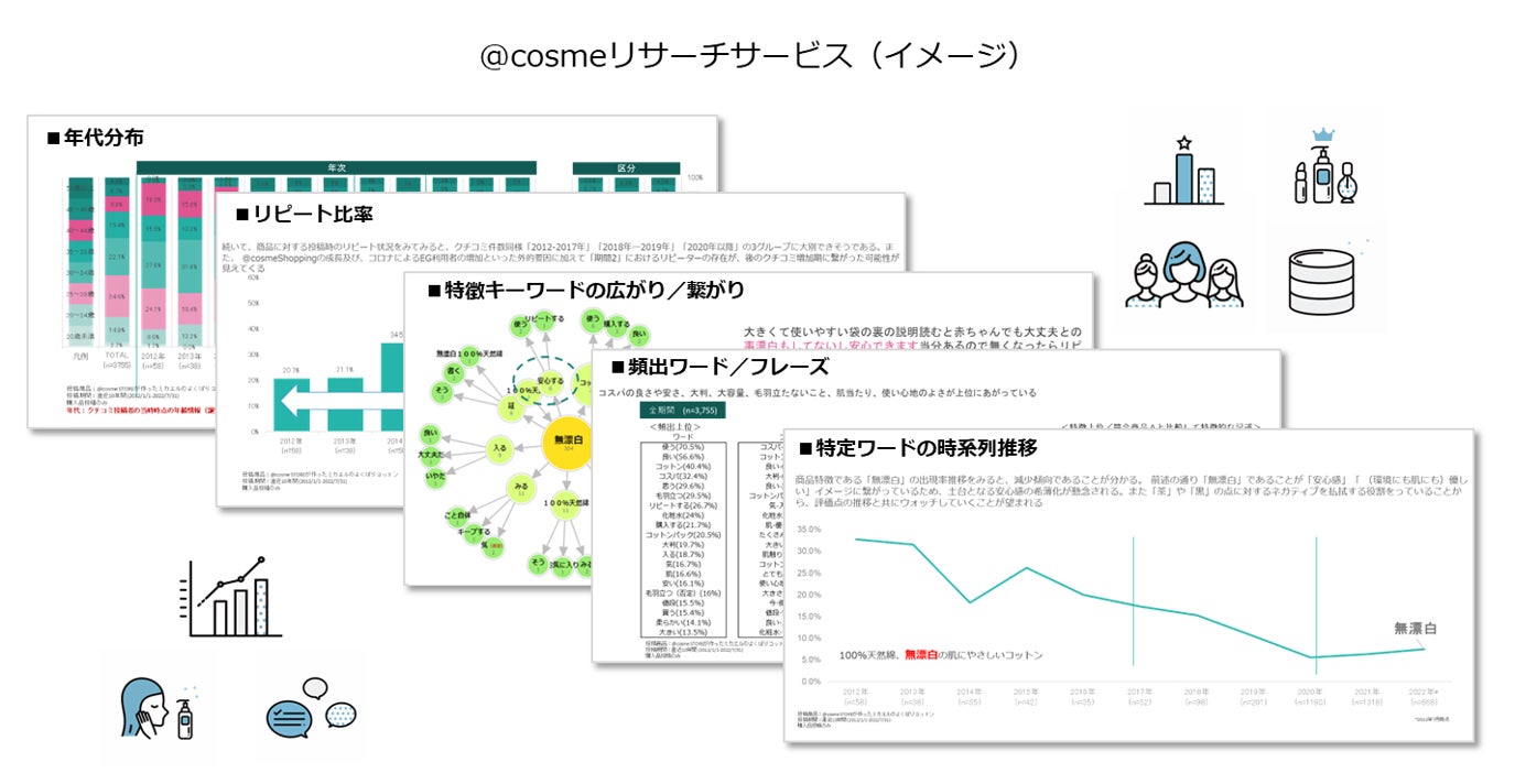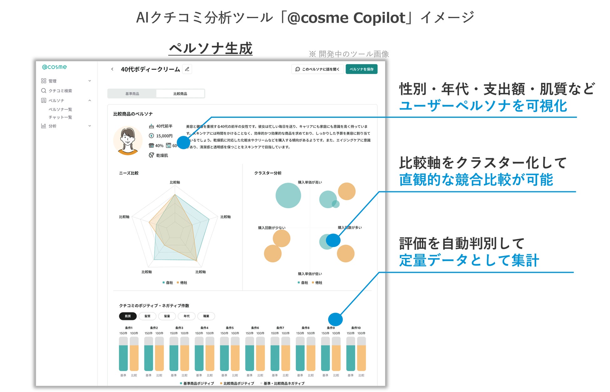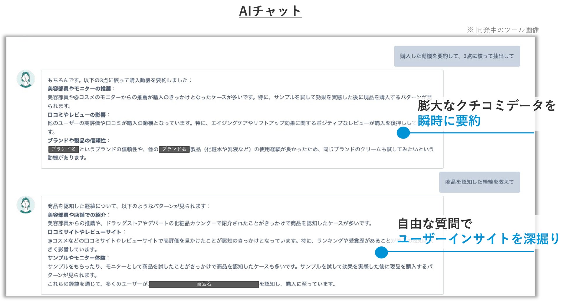 生成AIを活用して@cosmeに投稿されたクチコミを分析し、自ブランドの現状分析やマーケティング施策の振り返り、商品開発などに活用できるサービス