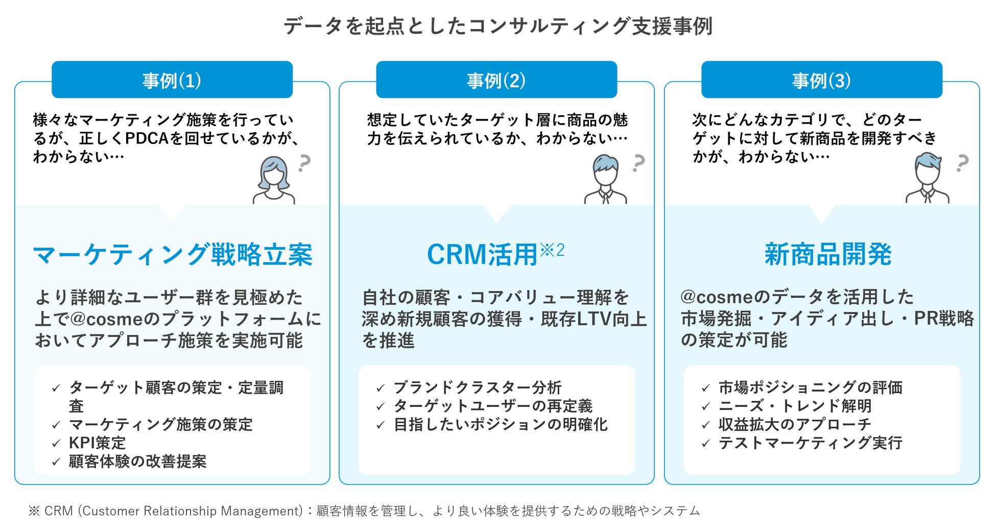 今回ローンチしたデータドリブンソリューションは、@cosmeが、コスメ・美容の総合サイト「@cosme」、EC「@cosme SHOPPING」、実店舗「@cosme STORE」を運営する中で蓄積してきた、カスタマージャーニーを一気通貫した膨大なデータを統合した統合データ基盤(以下、CDP)を活用して、以下の3つのサービスを提供するものです。本事業を通じて、ビューティー業界のデータドリブンな意思決定を促進してまいります。