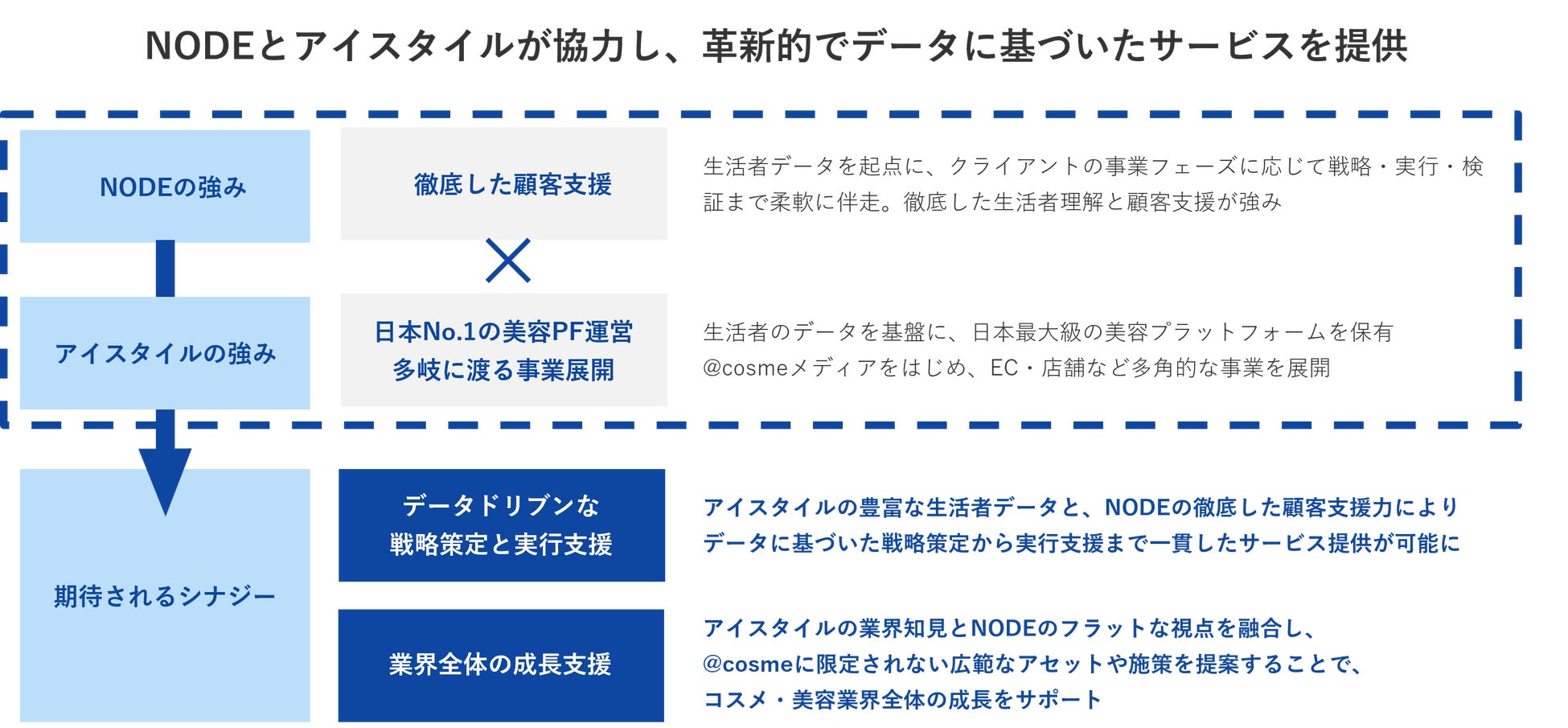 これまでのPoCの取り組みを通して、NODEのもつ「徹底した生活者理解と顧客視点に立ったCXデザイン」という強みと、アイスタイルの「日本No.1の美容プラットフォームを運営し多岐に渡る事業展開をしてきた経験による業界の知見」という強みを掛け合わせることで、コスメ・美容業界全体の成長をサポートできるという結論に至ったとから、この度の新会社の共同設立に至りました。