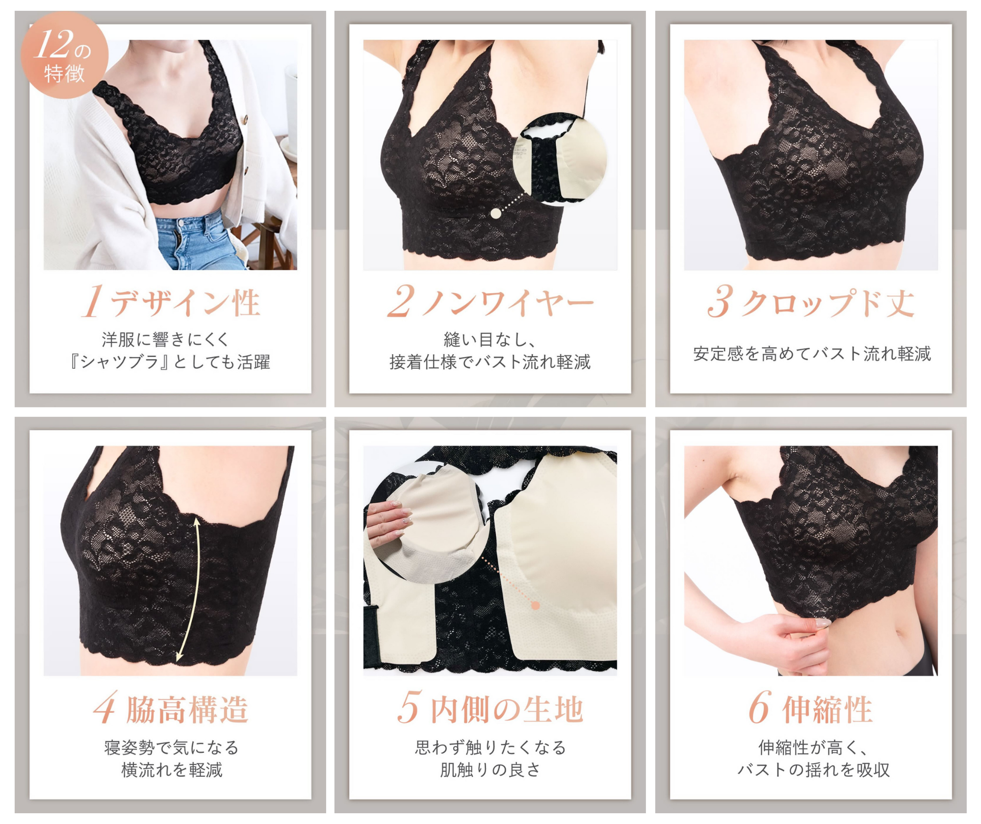 独自開発の接着縫製技術により、糸を使わないシームレス仕様を実現。さらに12項目にわたる工夫により、ノンワイヤーブラの快適さとワイヤーブラの安定感を1着で体感できます。
