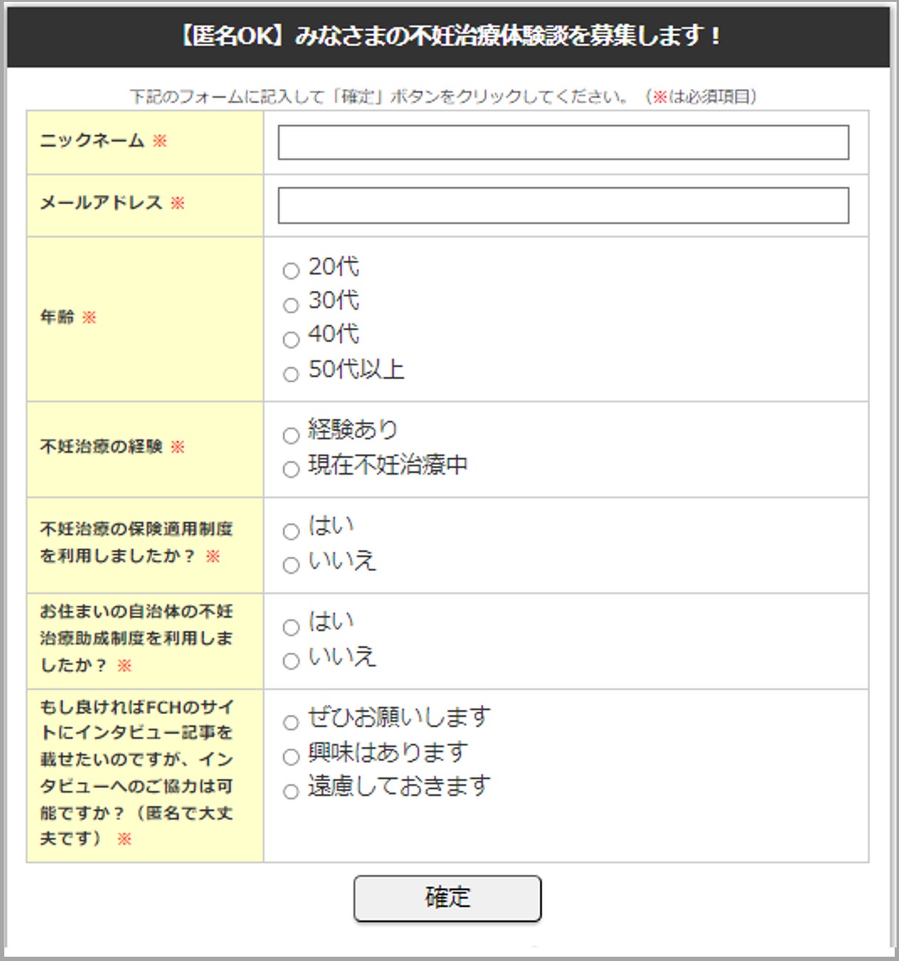 当サイトでは、不妊治療を公表されている著名人や、ご自身の不妊治療体験を発信されている方への取材に限定はせず、この「不妊治療体験談ページ」を広く不妊治療に関する情報収集の場とすべく、「体験談投稿フォーマット」を作成し、より多くの方から不妊治療の体験談を募ってまいります。