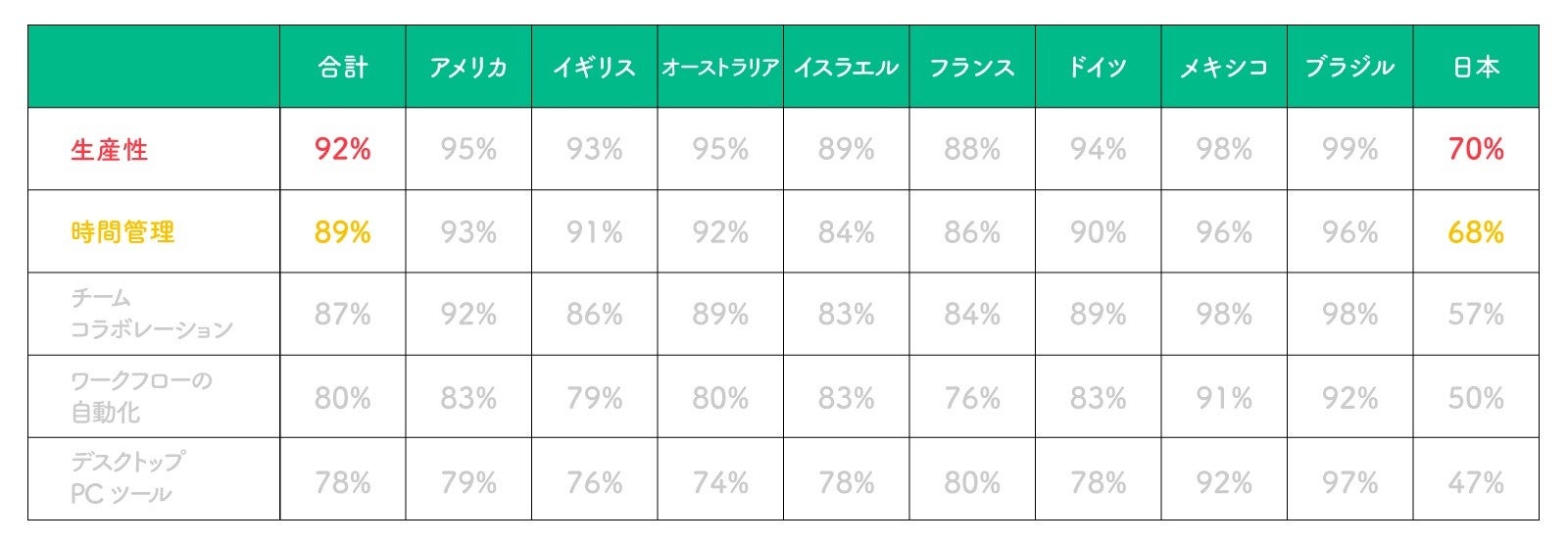 世界の92%のビジネスパーソンは自社が成功するうえで「生産性」を重要視しており、次いで「時間管理」が89%という結果になりました。一方、日本のビジネスパーソンが自社の成功のために「生産性」を重要視しているのは70%、「時間管理」は68%と低い結果となりました。