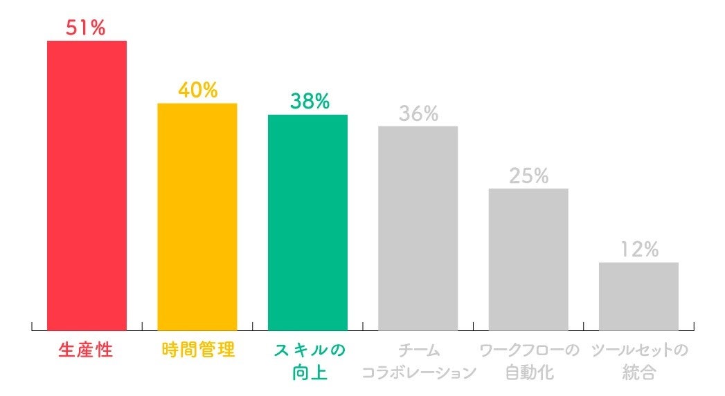 世界的に見て、51%のビジネスパーソンは「生産性」を最優先に考えると回答しました。次いで、「時間管理」が41%「スキルの向上」が38%という結果になりました。(複数回答)