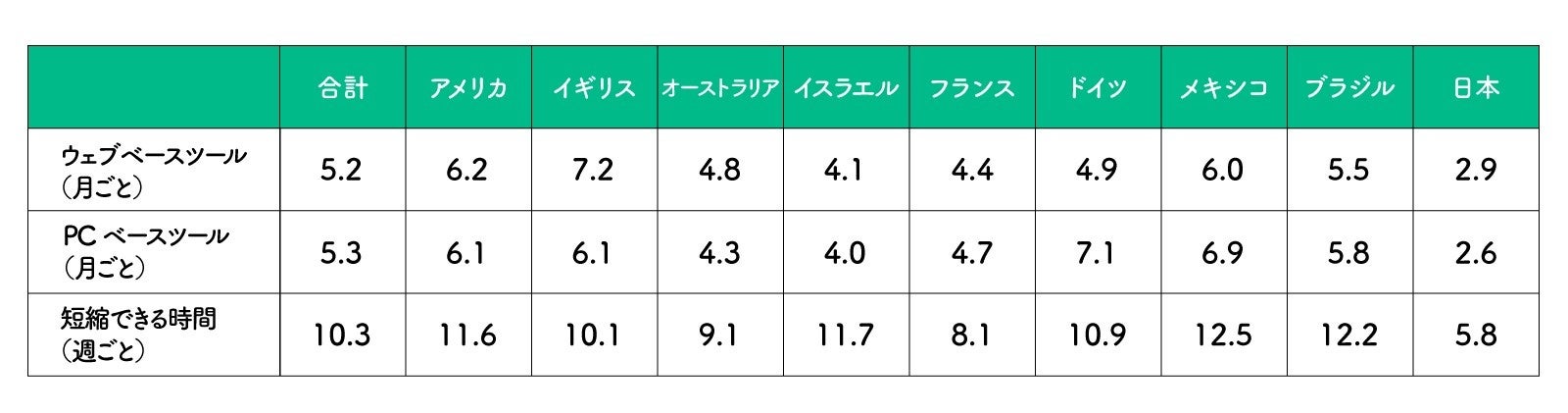 今回の調査結果から、世界的には約11種類の業務アプリ、または業務効率ツールが使われていることが判明しました。また、それらを統合することによって「週に10時間以上の業務時間短縮」になり、「生産性が上がる」と考えている人が多いこともわかりました。