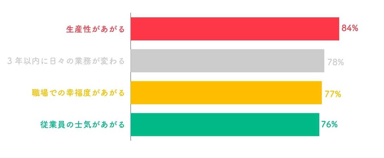 ワークフローの自動化で「生産性があがる」と84%の世界のビジネスパーソンが回答しました。さらに、ビジネスパーソンの職場での幸福度が上がると考えている人が77%、士気が向上すると考えている人が76%いることがわかりました。