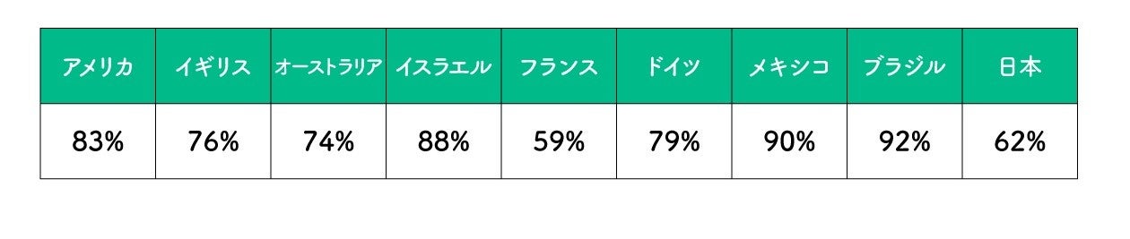 調査人数 :US・537名、UK・369名、オーストラリア・384名、イスラエル・386名、フランス・379名、ドイツ・375名、メキシコ・383名、ブラジル・385名、日本・364名、合計3562名
