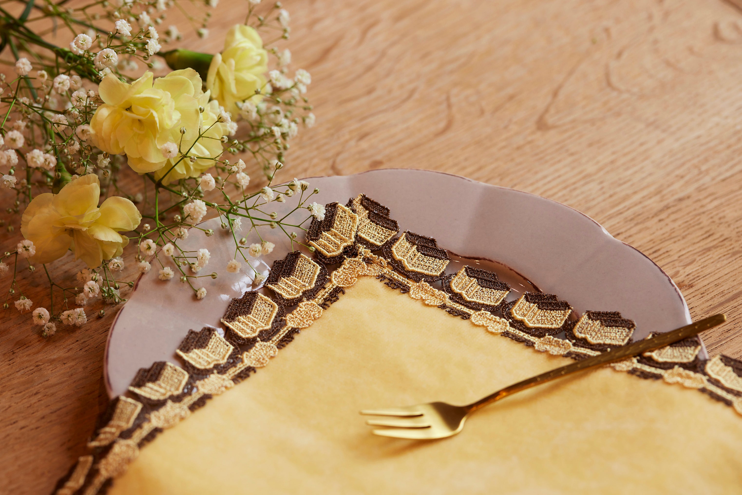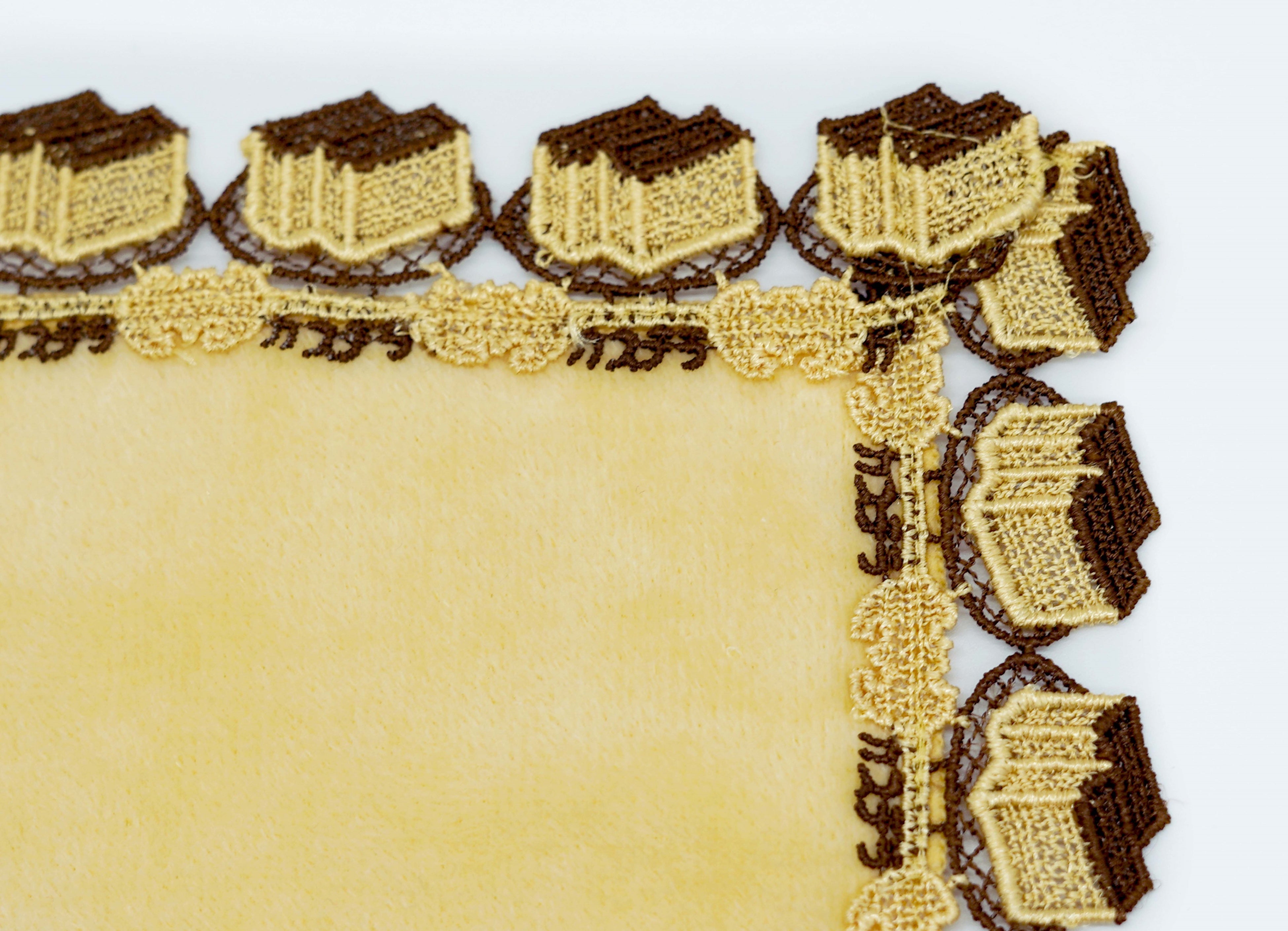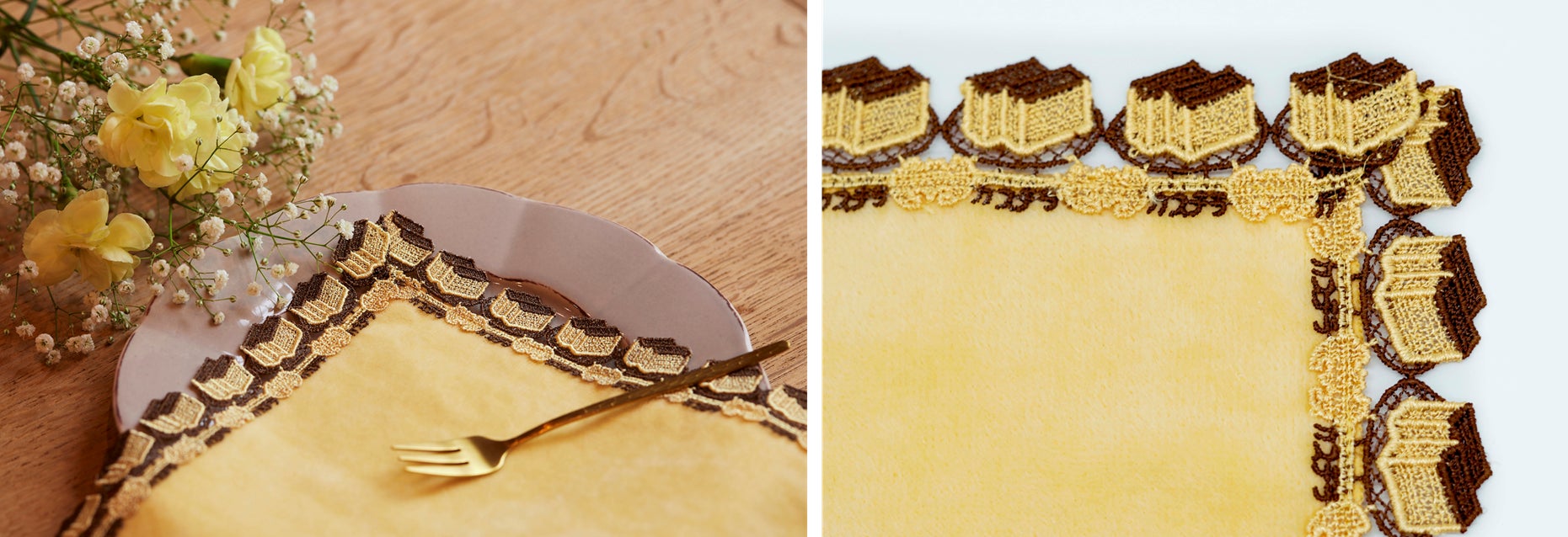 昔から愛され続けている老舗同士のコラボ。1901年(明治34年)に絹の輸出商として創業した横浜元町の老舗レースブランド・近沢レース店。レースや刺繍の美しさを伝えるべく、世界各地から最適な技術を選択、融合し独自の商品を手掛けています。福砂屋オリジナルのレースには、お皿にのったカステラと「カステラ」の文字、さらに福砂屋の商標として親しまれている蝙蝠(こうもり)が織り込まれています。美しく繊細ながらも遊び心のあるハンカチは、日々の生活を彩り、会話のきっかけ作りにもぴったりです。
