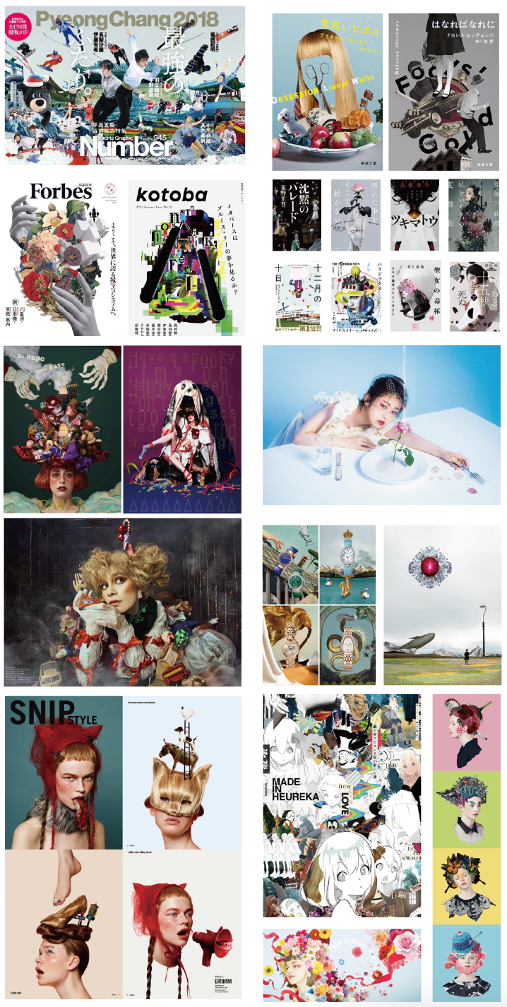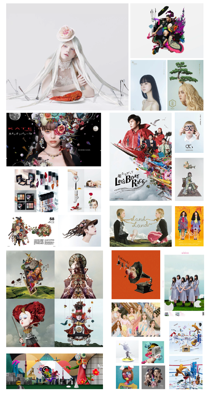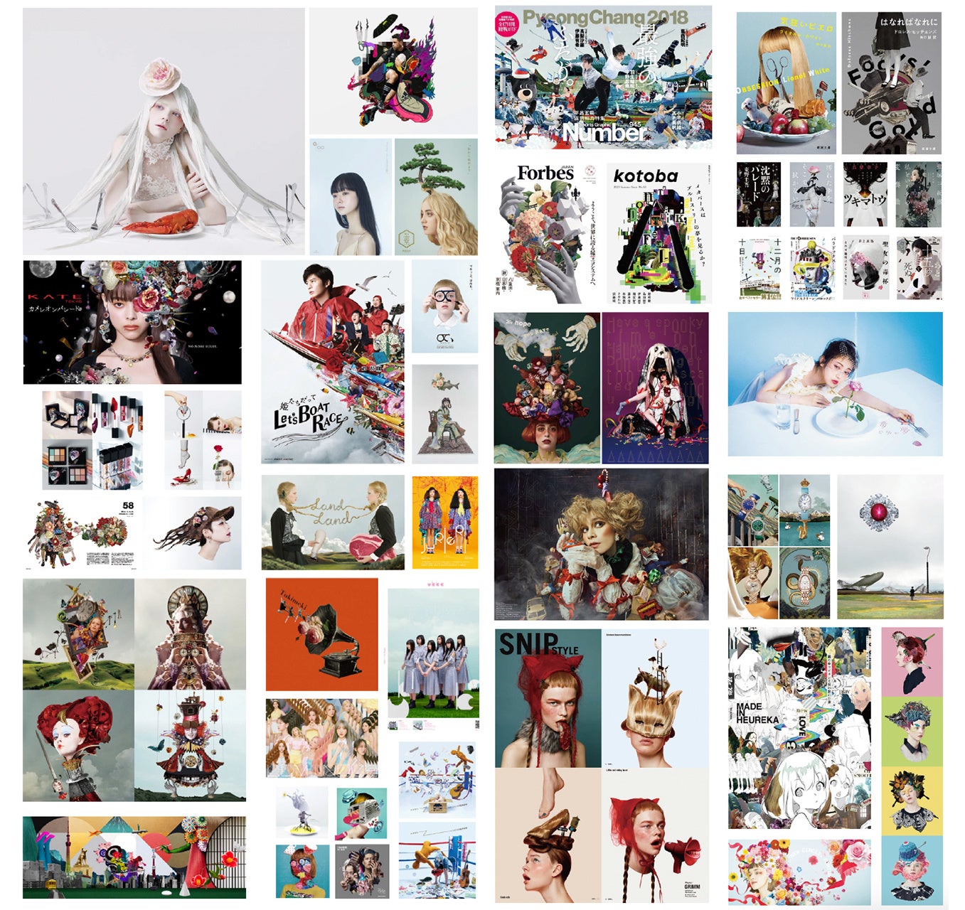 GUCCI、Viktor & Rolfなど世界的に有名なファッションブランドとのコラボレーションやディズニー映画「Alice Through the Looking Glass」とのコラボビジュアル、ボジョレ・ヌーヴォー公式ビジュアル、DYNAMITE BOA TRACEポスター、2019年ラグビー W杯でのadidasコラボ、コスメブランドKATEの「カメレオンパレード」のビジュアル、商品パッケージデザインなど様々な広告媒体に作品を提供。