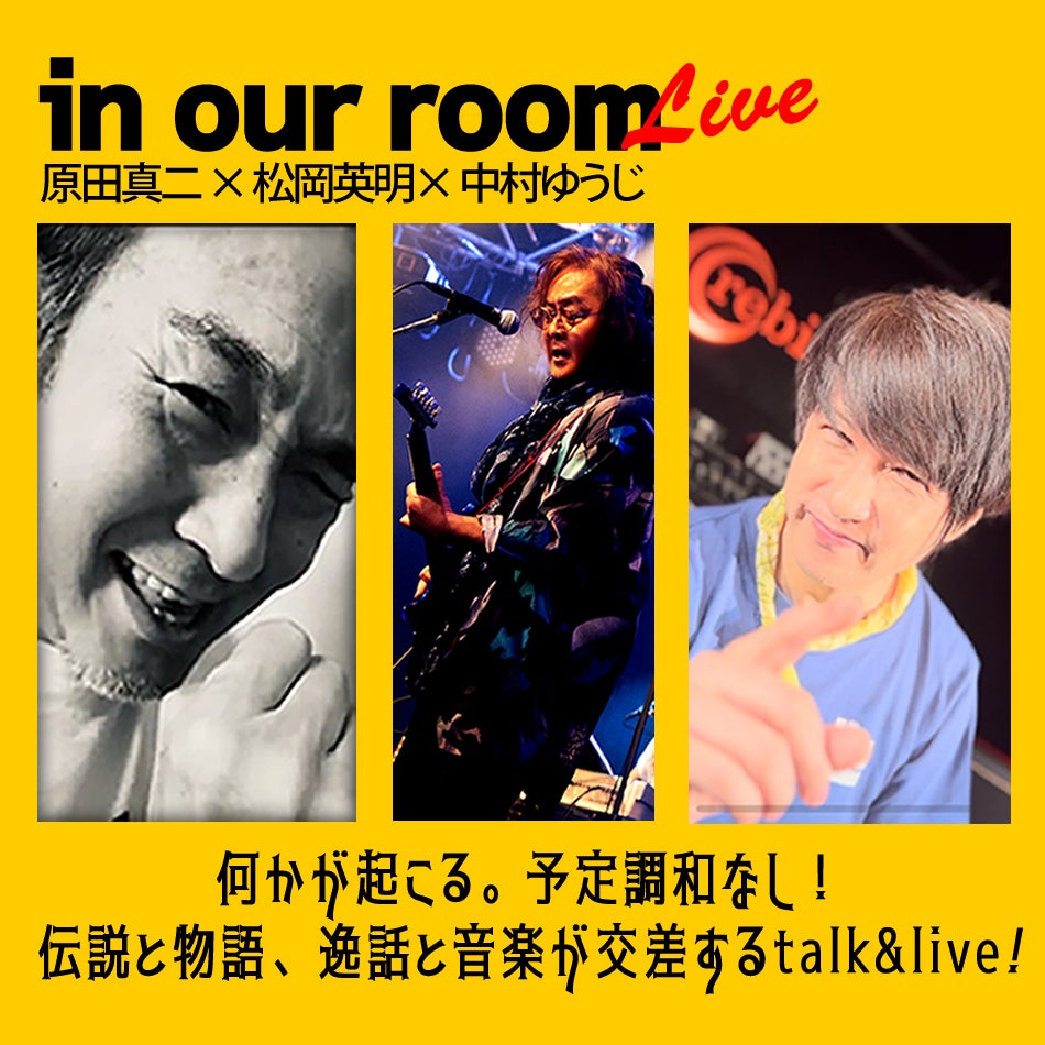 シンガーソングライターの原田真二と松岡英明が、俳優・コメディアン・パントマイマーの中村ゆうじのMCで展開する大パフォーマンス、"in our room"ライブが7月29日(土)19:00、渋谷のライブハウス「LOFT HEAVEN(ロフトヘブン)」で開催される。