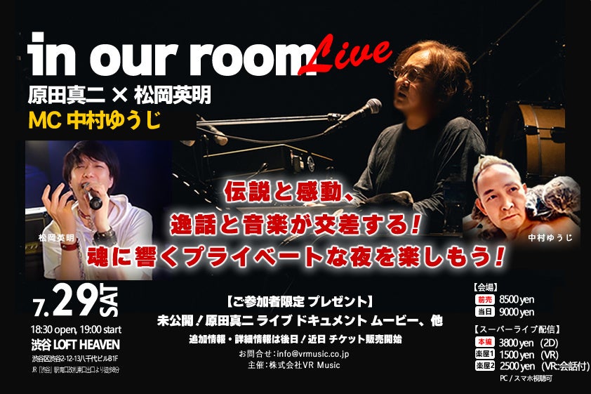 【原田真二×松岡英明×中村ゆうじ】が奇跡のコラボ!7月29日(土)、VR Music社主催 "in our room"ライブが、渋谷LOFT HEAVENで開催!ライブ配信/VR撮影も