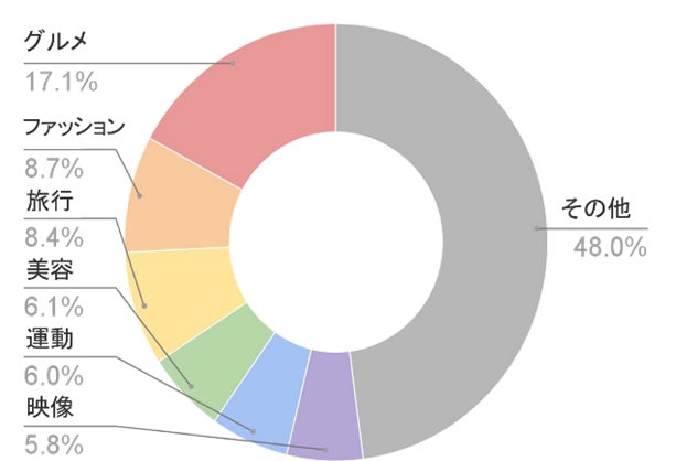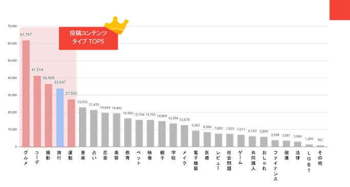インフルエンサーの投稿コンテンツのタイプのTOP5(1位グルメ、2位コーデ、3位撮影、4位旅行、5位運動)で全体の5割以上を占めています。旅行や運動など、アフターコロナの生活様式を見据えた業界のPR投稿が増加傾向です。