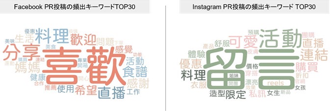 PR投稿におけるFacebookとInstagramの使用頻度の高いキーワードTOP30を集計しました。Facebookでは「お母さん」、「料理」、「レシピ」、「美味」など子供を持つ女性やグルメ、食品をテーマとしたキーワードが多く使用されていることがわかります。また、Instagramに関しては「女性」、「姉妹」、「キレイ」など女性全般を狙ったキーワードが多く使用されています。さらに、「コメント」というキーワードの使用頻度も高く、PR投稿においてフォロワーとのコミュニケーションを重視するインフルエンサーの姿勢が明らかになりました。
