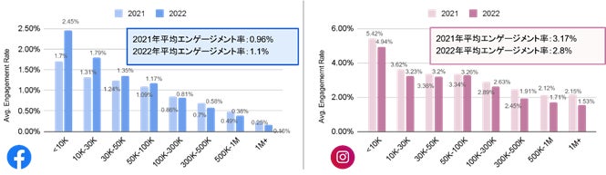 FacebookにおけるPR投稿のエンゲージメント率は、フォロワー1万人以下のナノインフルエンサーが2.45%、一方100万人以上のトップインフルエンサーは0.46%と、ナノインフルエンサーは5倍以上の影響力があると分かります。また、Instagramは、2021年に比べ平均エンゲージメント率が3.17%から2.8%に低下しており、新規インフルエンサー増加による競争の激化が数字に表れています。