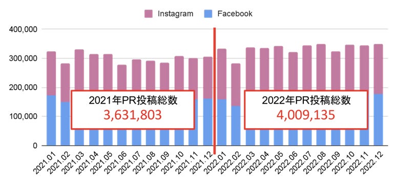 KOL Radarで、台湾のFacebook、Instagramにおける2021年~2022年までのすべてのPR投稿を集計した結果、総数は764万件に達していました。
