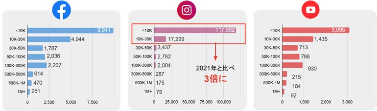 また、最新の動向として、フォロワー数が3万人以下のマイクロインフルエンサーの数がInstagramにおいて、2021年の3倍にまで急増していることがわかりました。新規参入のインフルエンサーは運営ハードルの低いInstagramで増加している傾向が高いことがわかりました。