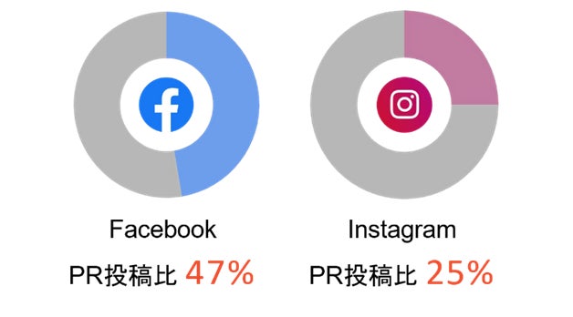 また、Facebookでは、全投稿のうちの半分に近い47%がPR投稿であり、いかにインフルエンサーのマーケティング活用が活発かが明らかになっています。