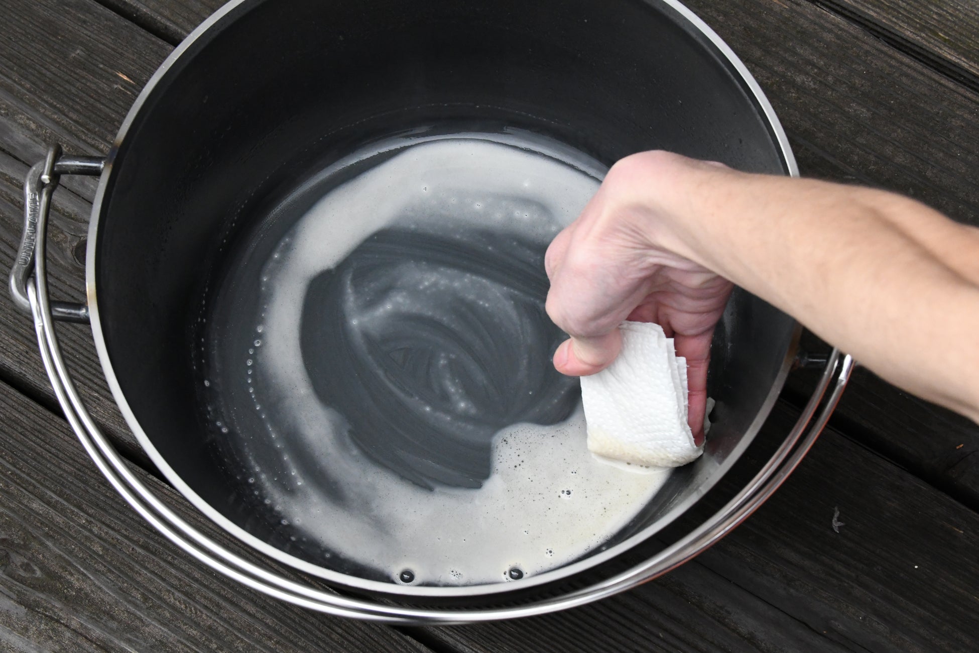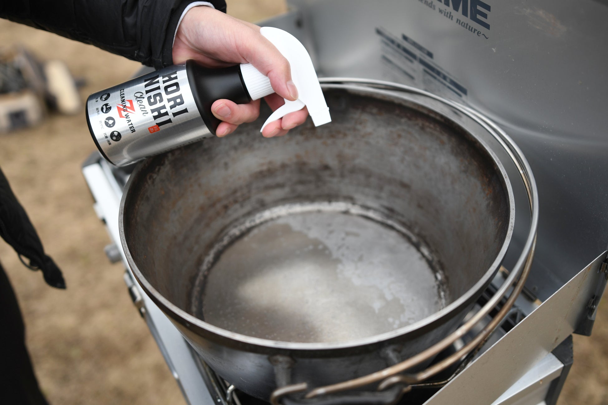 ※鉄製のダッチオーブンにごま油を垂らし、「HORINISHI Clean Z(ほりにしクリーンゼット)」を吹きかけております。