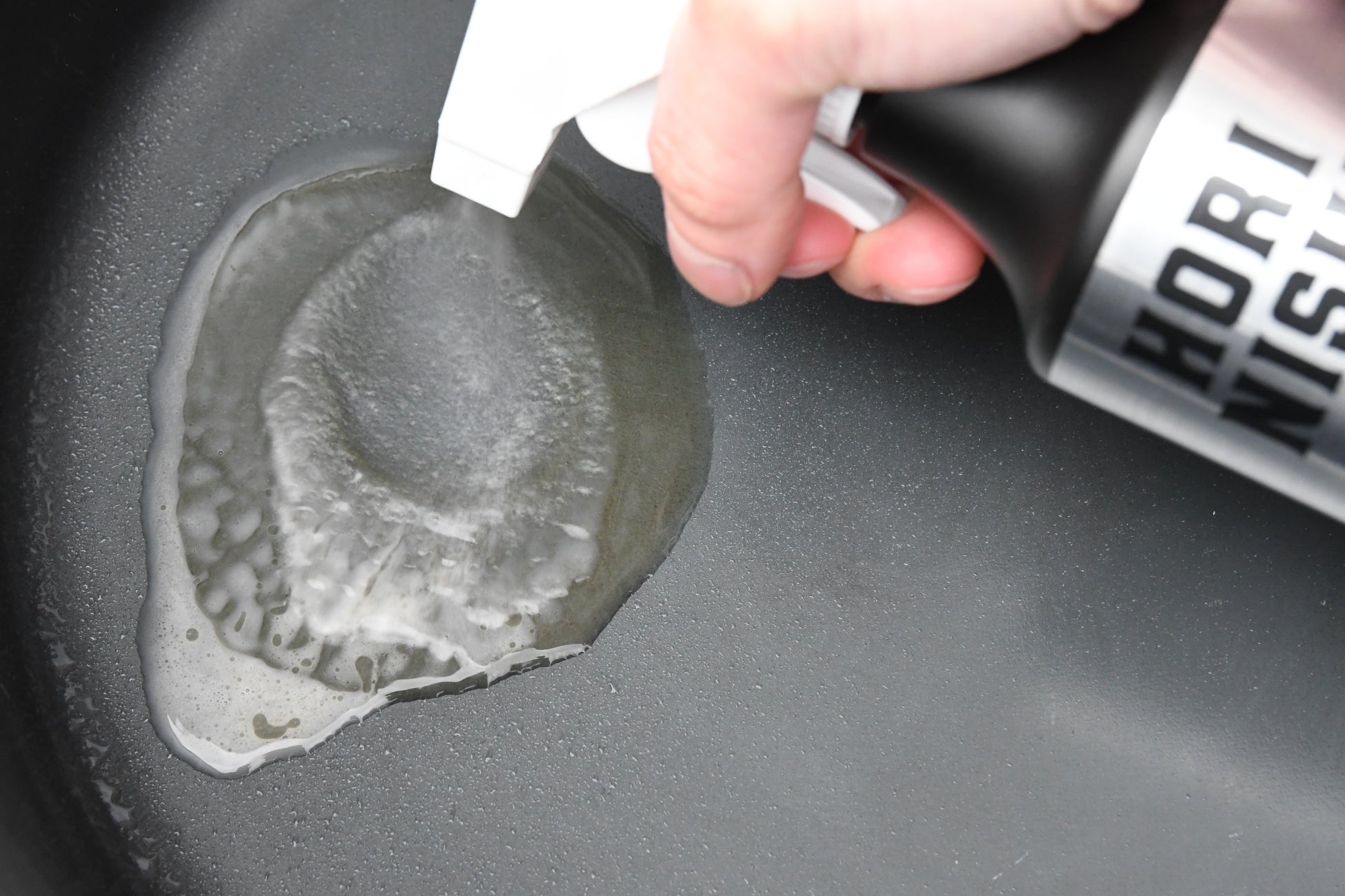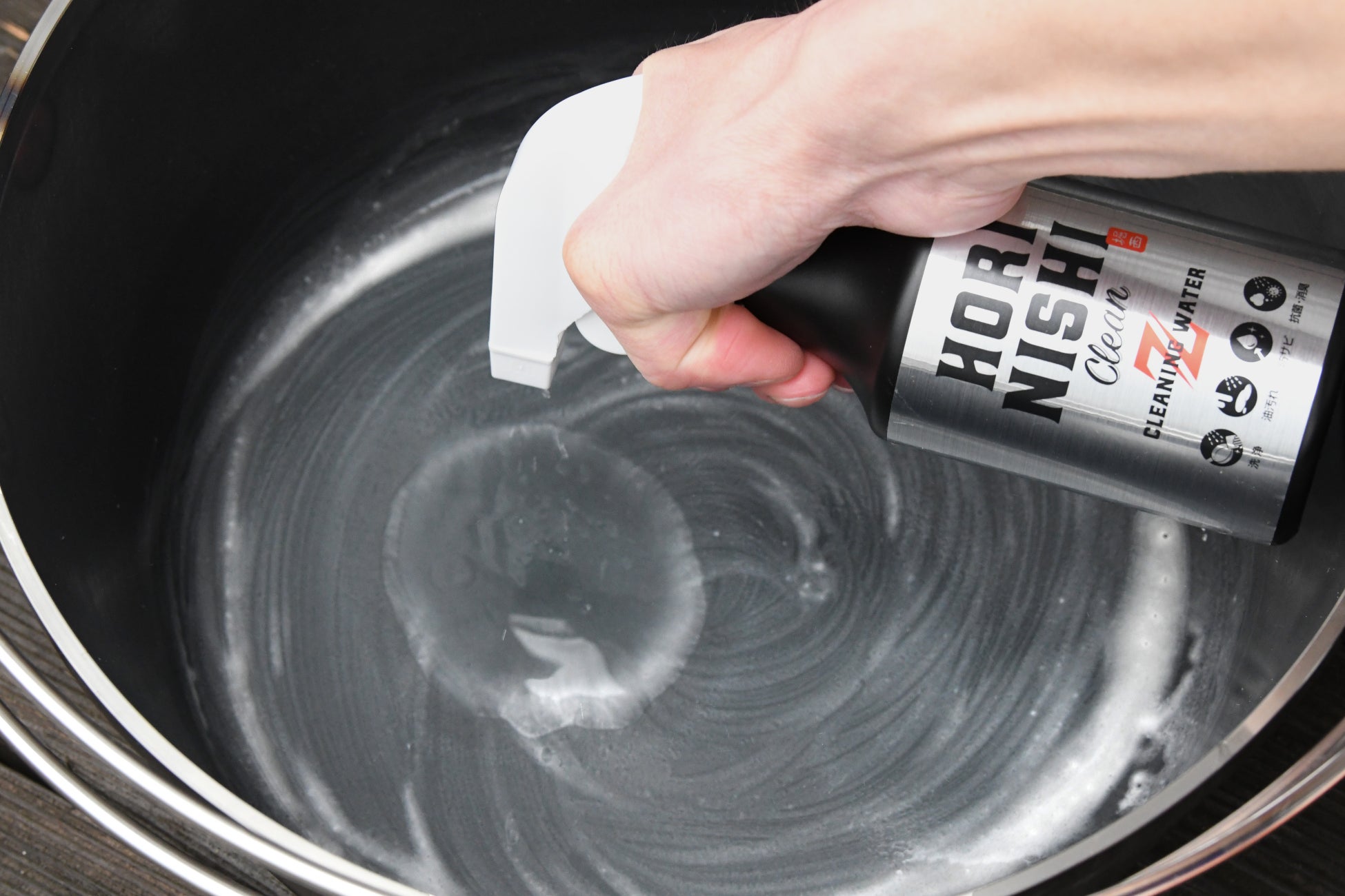 ※鍋全体の油汚れに「HORINISHI Clean Z(ほりにしクリーンゼット)」がいきわたるよう吹きかけ、