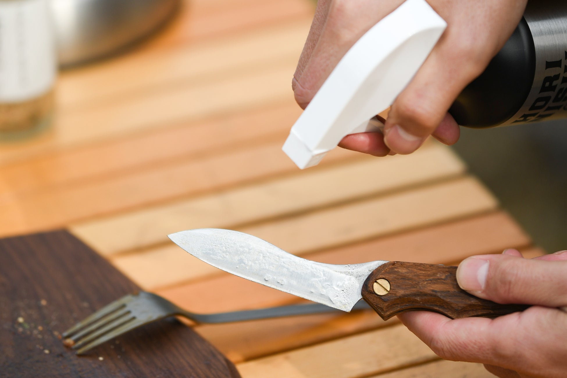アウトドアシーンで水の確保が難しい時、洗剤を使用できない時、また災害時にも食器やダッチオーブン等の調理器具に吹きかけて拭き取るだけで油汚れを落とし、鉄製品に使用した際は防錆効果まで発揮します。食器を水洗い場まで運ぶ手間が省けるだけでなく、手を水で濡らすこともない為、冬場にも重宝していただけます。