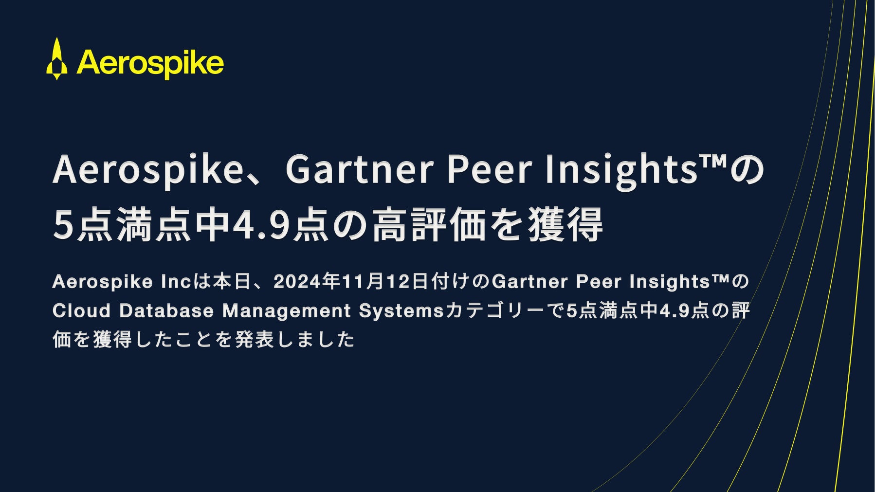 Aerospike Inc(本社:米国カリフォルニア州マウンテンビュー、以下「Aerospike」)は本日、2024年11月12日付けのGartner Peer InsightsTMのCloud Database Management Systemsカテゴリーで5点満点中4.9点の評価を獲得したことを発表しました。