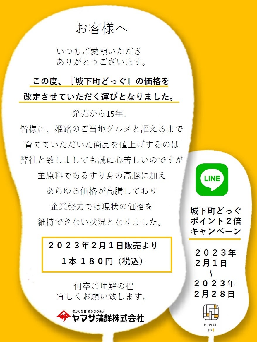 ヤマサ蒲鉾株式会社(兵庫県姫路市夢前町置本327-16 代表取締役社長 名田和由)は、『城下町どっぐ』の価格を2023年2月1日販売分より150円(税込)から180円(税込)に改定いたします。