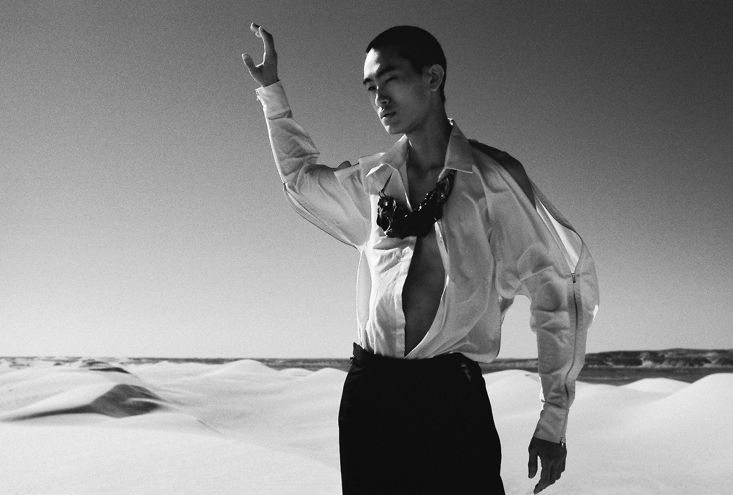 そして 2025 年、節目に相応しい 2024 年を経て YUIMA NAKAZATO は、さらなる一歩を踏みだす。そのスタートである 2025 SPRING & SUMMER コレクション《FADE ―砂漠が語る宇宙と巨大ナマズの物語は衣服に宿るか―》で中里唯馬は、コレクションのインスピレーションのひとつでもあるエジプトの白砂漠を移動するなかでアクシデントに見舞われた。その際、中里の胸中で、巨大ナマズの神話についての妄想が膨らみ、慄きが生まれた。そこで中里は、物語と衣服の関係について想い至る。また、最新コレクション《FADE》に至るキャリアのなかで「人間の美しくあろうとする尊厳」に触れ、機能性が偏重される現代にありながら「装飾性の価値を改めて追求する」と中里は意を新たにした。もちろんこの志は、モードの初期衝動への単なる回帰ではない。失われた機能に替わるのは、「いま」ここでしか成立し得ない同時代的対話から生まれる物語であろう。物語とファッション、いずれも人間を人間たらしめる大きな特徴であり、これまでも中里は、全ての感覚をもって、あらゆる事象のナラティブを捉え、YUIMA NAKAZATO にしか語りえぬ物語をクチュールに編み込んできた。しかし、これからは、わたしたちも中里が抱える大きな課題を共有し、YUIMA NAKAZATO のクチュールに物語を託さなくてはならない。