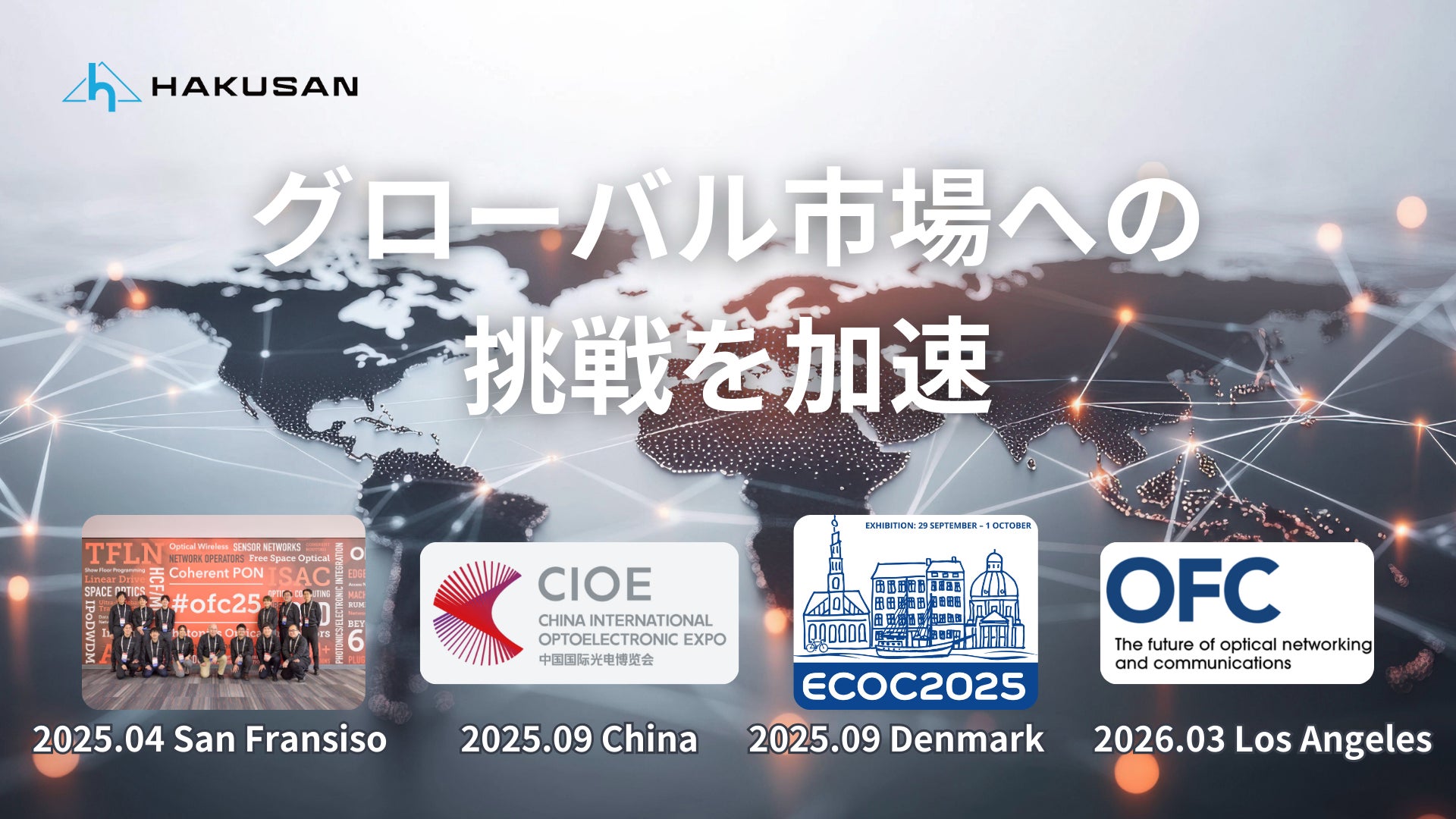 株式会社白山(本社:石川県金沢市)は、2025年に開催される光通信業界の世界三大展示会「CIOE(中国・深圳)」および「ECOC(デンマーク・コペンハーゲン)」に初出展します。今年4月には米国で開催された「OFC 2025」にも初参加しており、今回の連続出展により、米国・中国・欧州という三大市場でのプレゼンス強化を加速させます。展示ブースでは、次世代MTフェルールや高密度光コネクタなど、光通信インフラを支える最新技術を披露し、グローバル市場での認知拡大と新たなビジネス機会の創出を目指します。