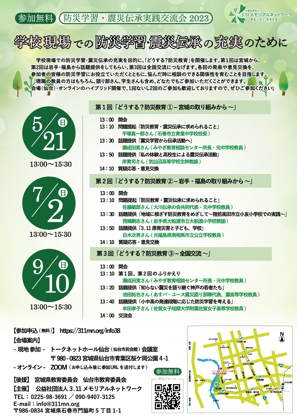 5月21日、防災学習・震災伝承実践交流会2023 第1回「どうする?防災教育①」を会場(仙台)とオンラインで開催します。
