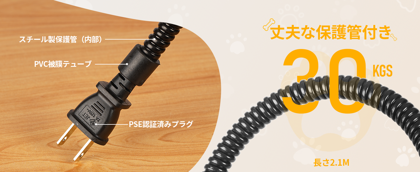 スチール製保護管、PVC被膜チューブとPSえ認証済みプラグを採用し、しっぽ家族の安全を守ります。
