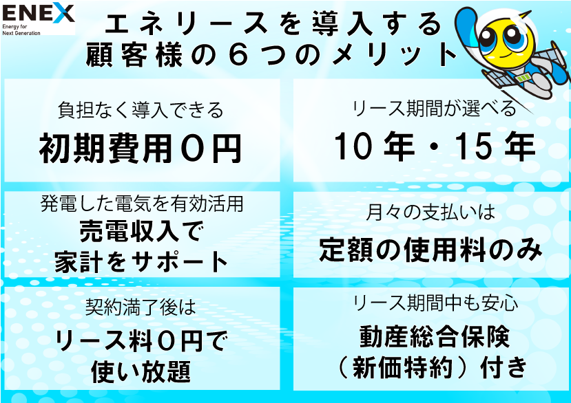 「エネリース」とは、戸建て住宅を購入される方に向けた「個人住宅向けの太陽光設備リース」です。