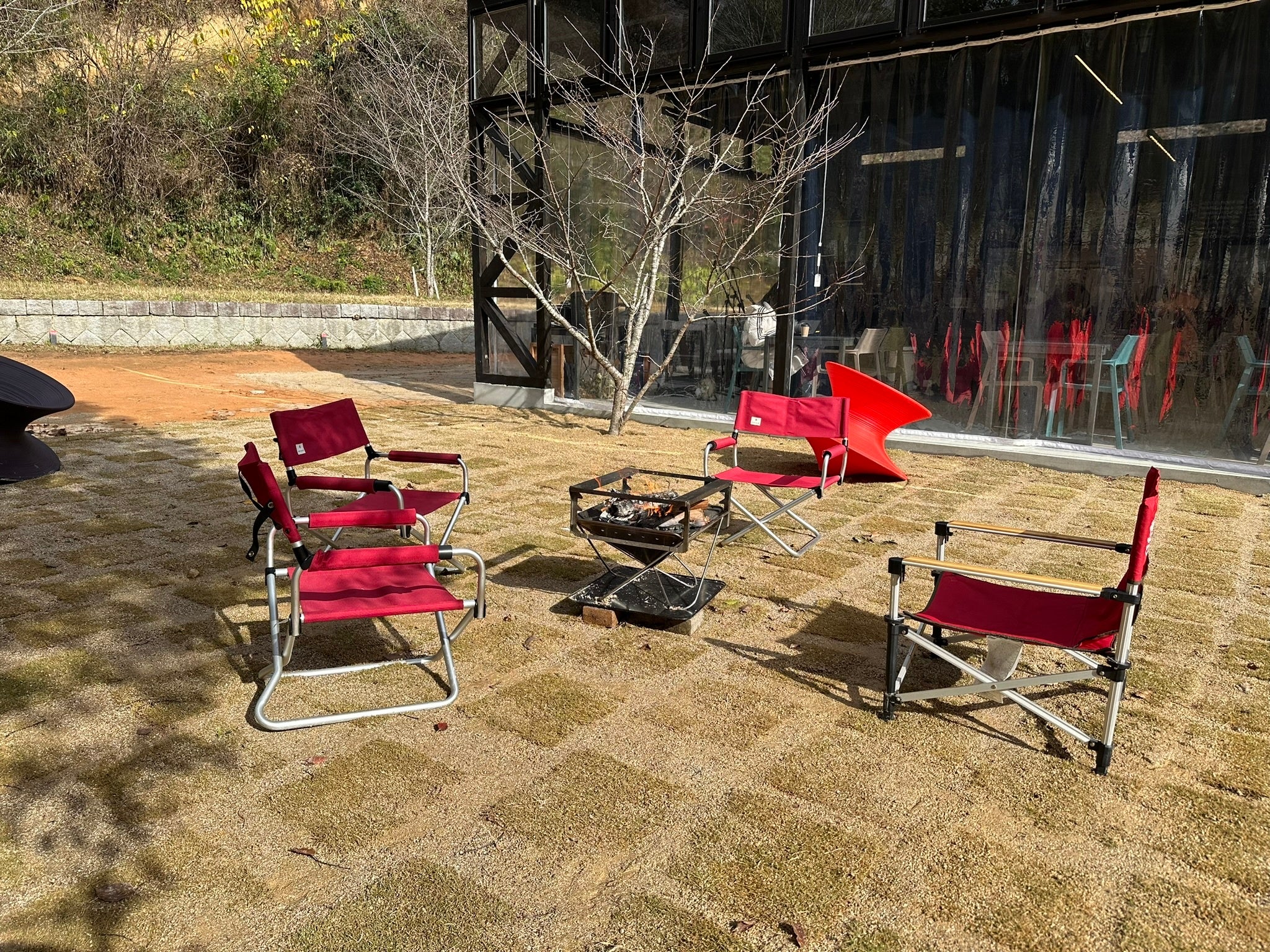 半屋外のスペースに約40席をご用意。OND PARKの自然に囲まれた環境で四季折々の景観を楽しみながら食べる食事はより一層美味しく、気分をリフレッシュしてくれます。