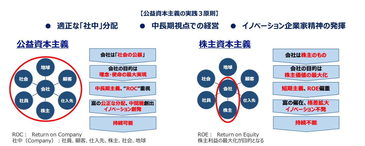 「会社は社会の公器」であることを前提とする公益資本主義では、適正な社中分配と中長期視点でイノベーション精神を持った経営により、持続的な成長を目指す。