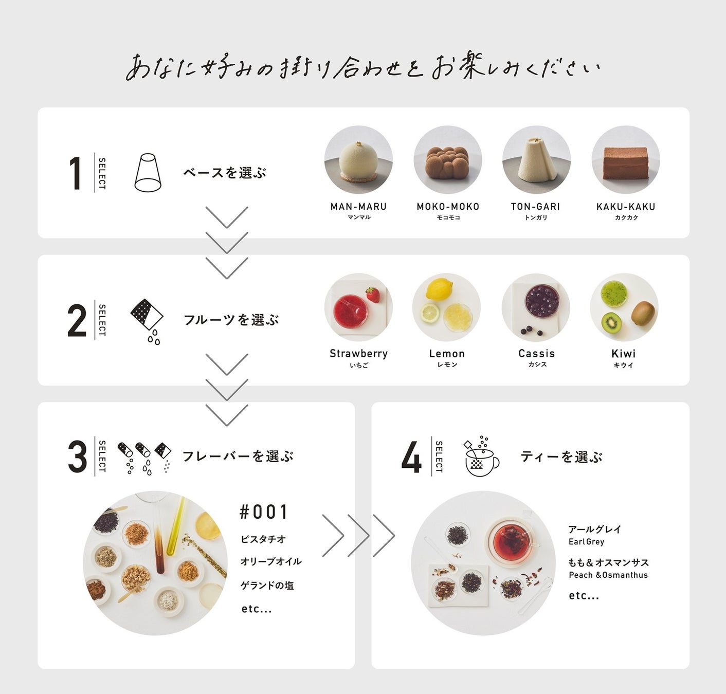 ベース×フルーツ×フレーバー×フレーバーティの4つの掛け合わせを自分でセレクトできるセットで、選ぶ時から食べ終わるまでのワクワクする体験を提供します。